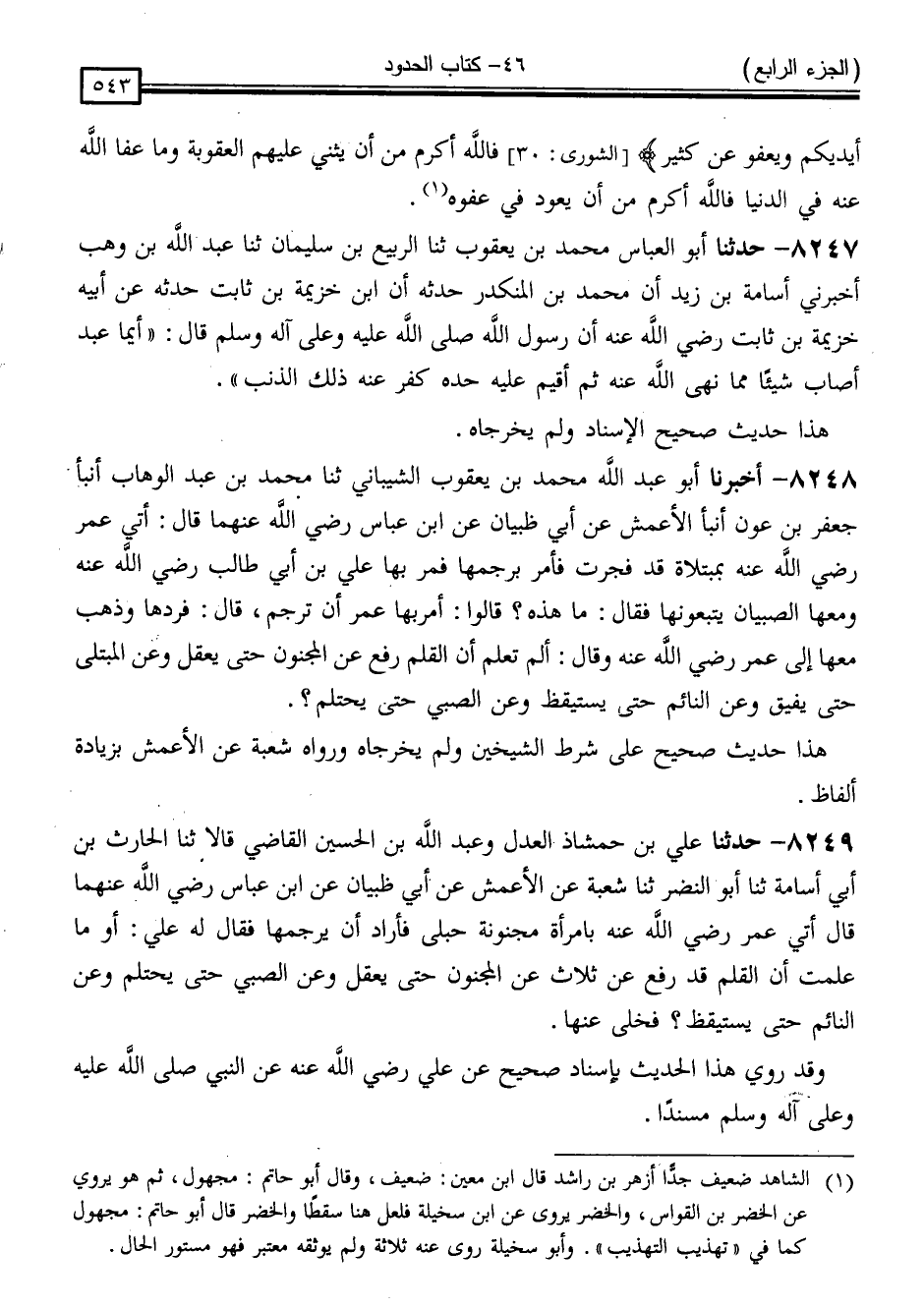 8249 - حَدَّثَنَا عَلِيُّ بْنُ حَمْشَاذَ الْعَدْلُ ، وَعَبْدُ اللَّهِ بْنُ الْحُسَيْنِ الْقَاضِي ، قَالَا: ثَنَا الْحَارِثُ بْنُ أَبِي أُسَامَةَ ، ثَنَا أَبُو النَّضْرِ ، ثَنَا شُعْبَةُ ، عَنِ الْأَعْمَشِ ، عَنْ أَبِي ظَبْيَانَ ، عَنِ ابْنِ عَبَّاسٍ ، رَضِيَ اللَّهُ عَنْهُمَا قَالَ: أُتِيَ عُمَرُ رَضِيَ اللَّهُ عَنْهُ بِامْرَأَةٍ مَجْنُونَةٍ حُبْلَى فَأَرَادَ أَنْ يَرْجُمَهَا ، فَقَالَ لَهُ عَلِيٌّ: " أَوَمَا عَلِمْتَ أَنَّ الْقَلَمَ قَدْ رُفِعَ عَنْ ثَلَاثٍ: عَنِ الْمَجْنُونِ حَتَّى يَعْقِلَ ، وَعَنِ الصَّبِيِّ حَتَّى يَحْتَلِمَ ، وَعَنِ النَّائِمِ حَتَّى يَسْتَيْقِظَ " فَخَلَّى عَنْهَا "