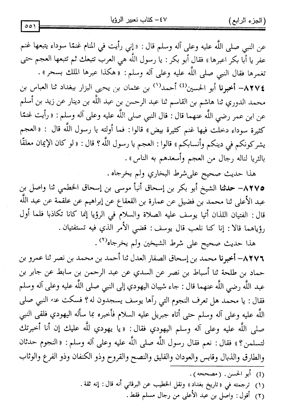 8274 - أَخْبَرَنَا أَبُو الْحُسَيْنِ أَحْمَدُ بْنُ عُثْمَانَ بْنِ يَحْيَى الْبَزَّارُ * ، بِبَغْدَادَ ، ثَنَا الْعَبَّاسُ بْنُ مُحَمَّدٍ الدُّورِيُّ ، ثَنَا هَاشِمُ بْنُ الْقَاسِمِ ، ثَنَا عَبْدُ الرَّحْمَنِ ، عَنْ عَبْدِ اللَّهِ بْنِ دِينَارٍ ، عَنْ زَيْدِ بْنِ أَسْلَمَ ، عَنِ ابْنِ عُمَرَ رَضِيَ اللَّهُ عَنْهُمَا قَالَ: قَالَ النَّبِيُّ صَلَّى اللَّهُ عَلَيْهِ وَسَلَّمَ: " رَأَيْتُ غَنَمًا كَثِيرَةً سَوْدَاءَ دَخَلَتْ فِيهَا غَنْمٌ كَثِيرَةٌ بِيضٌ " قَالُوا: فَمَا أَوَّلْتَهُ يَا رَسُولَ اللَّهِ ؟ قَالَ: " الْعَجَمُ يَشْرَكُونَكُمْ فِي دِينِكُمْ وَأَنْسَابِكُمْ " قَالُوا: الْعَجَمُ يَا رَسُولَ اللَّهِ ؟ قَالَ: " لَوْ كَانَ الْإِيمَانُ مُعَلَّقًا بِالثُّرَيَّا لَنَالَهُ رِجَالٌ مِنَ الْعَجَمِ وَأَسْعَدَهُمْ بِهِ النَّاسُ "