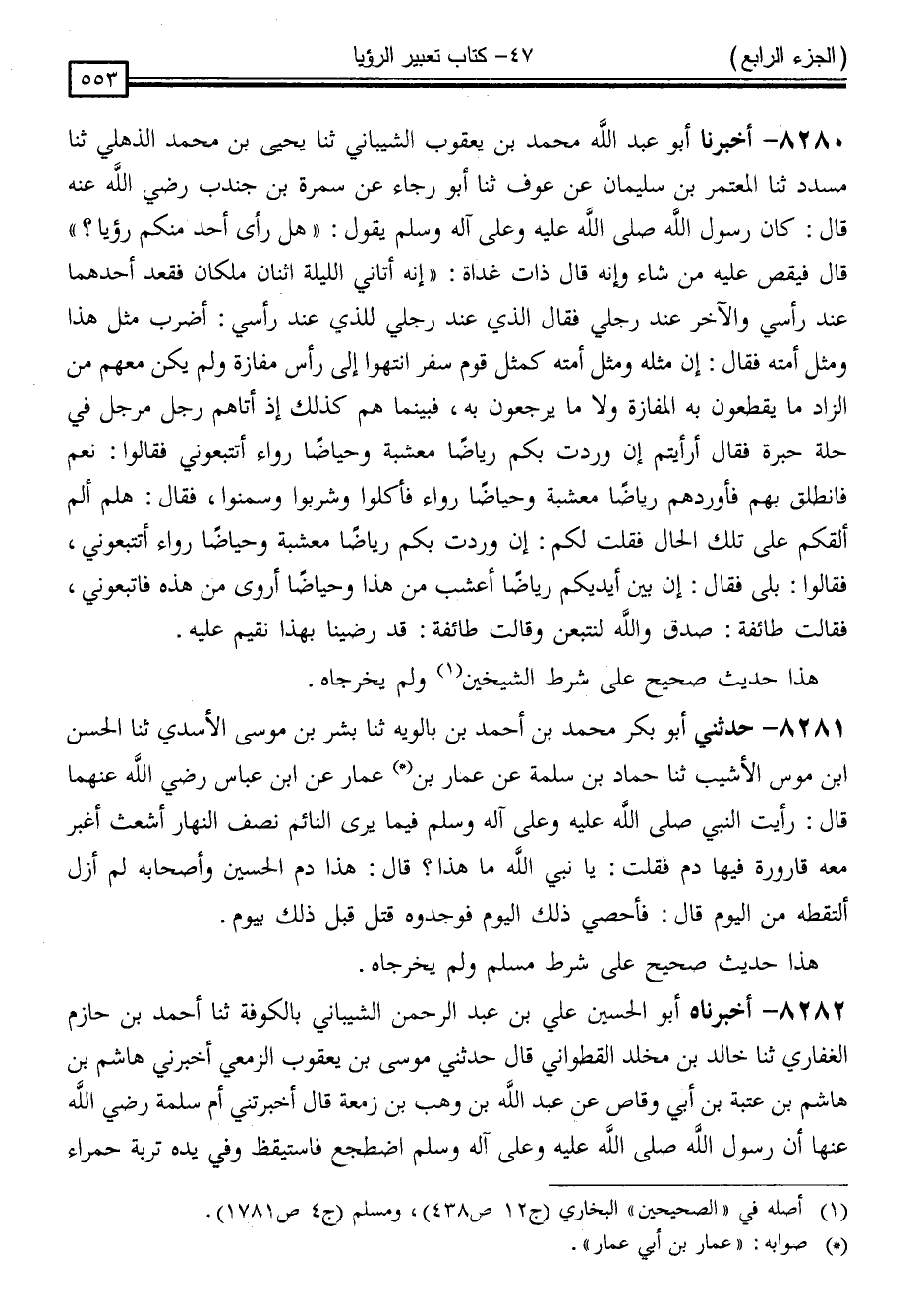 8280 - أَخْبَرَنَا أَبُو عَبْدِ اللَّهِ مُحَمَّدُ بْنُ يَعْقُوبَ الشَّيْبَانِيُّ ، ثَنَا يَحْيَى بْنُ مُحَمَّدٍ الذُّهْلِيُّ ، ثَنَا مُسَدَّدٌ ، ثَنَا الْمُعْتَمِرُ بْنُ سُلَيْمَانَ ، عَنْ عَوْفٍ ، ثَنَا أَبُو رَجَاءٍ ، عَنْ سَمُرَةَ بْنِ جُنْدُبٍ رَضِيَ اللَّهُ عَنْهُ قَالَ: كَانَ رَسُولُ اللَّهِ صَلَّى اللَّهُ عَلَيْهِ وَسَلَّمَ ، يَقُولُ: " هَلْ رَأَى أَحَدٌ مِنْكُمْ رُؤْيَا ؟ " قَالَ: فَيَقُصُّ عَلَيْهِ مَنْ شَاءَ ، وَإِنَّهُ قَالَ ذَاتَ غَدَاةٍ : " إِنَّهُ أَتَانِي اللَّيْلَةَ اثْنَانِ مَلَكَانِ فَقَعَدَ أَحَدُهُمَا عِنْدَ رَأْسِي وَالْآخَرُ عِنْدَ رِجْلَيَّ ، فَقَالَ الَّذِي عِنْدَ رِجْلَيَّ لِلَّذِي عِنْدَ رَأْسِي: اضْرِبْ مَثَلَ هَذَا وَمَثَلَ أُمَّتِهِ ، فَقَالَ: إِنَّ مَثَلَهُ وَمَثَلَ أُمَّتِهِ كَمَثَلِ قَوْمٍ سَفْرٍ انْتَهَوْا إِلَى رَأْسِ مَفَازَةٍ وَلَمْ يَكُنْ مَعَهُمْ مِنَ الزَّادِ مَا يَقْطَعُونَ بِهِ الْمَفَازَةَ وَلَا مَا يَرْجِعُونَ بِهِ فَبَيْنَمَا هُمْ كَذَلِكَ إِذْ أَتَاهُمْ رَجُلٌ مُرَجِّلٌ فِي حُلَّةٍ حِبَرَةٍ ، فَقَالَ: أَرَأَيْتُمْ إِنْ وَرَدْتُ بِكُمْ رِيَاضًا مُعْشِبَةً وَحِيَاضًا رُوَاءً أَتَتَّبِعُونِي ؟ فَقَالُوا: نَعَمْ ، فَانْطَلَقَ بِهِمْ فَأَوْرَدَهُمْ رِيَاضًا مُعْشِبَةً وَحِيَاضًا رُوَاءً فَأَكَلُوا وَشَرِبُوا وَسَمِنُوا ، فَقَالَ لَهُمْ: أَلَمْ أَلْقَكُمْ عَلَى تِلْكَ الْحَالِ فَقُلْتُ لَكُمْ: إِنْ وَرَدْتُ بِكُمْ رِيَاضًا مُعْشِبَةً وَحِيَاضًا رُوَاءً أَتَتَّبِعُونِي ، فَقَالُوا: بَلَى ، فَقَالَ: إِنَّ بَيْنَ أَيْدِيكُمْ رِيَاضًا أَعْشَبَ مِنْ هَذَا وَحِيَاضًا أَرْوَى مِنْ هَذِهِ فَاتَّبِعُونِي ، فَقَالَتْ طَائِفَةٌ: صَدَقَ وَاللَّهِ لَنَتَّبِعَنَّ ، وَقَالَتْ طَائِفَةٌ: قَدْ رَضِينَا بِهَذَا نُقِيمُ عَلَيْهِ "