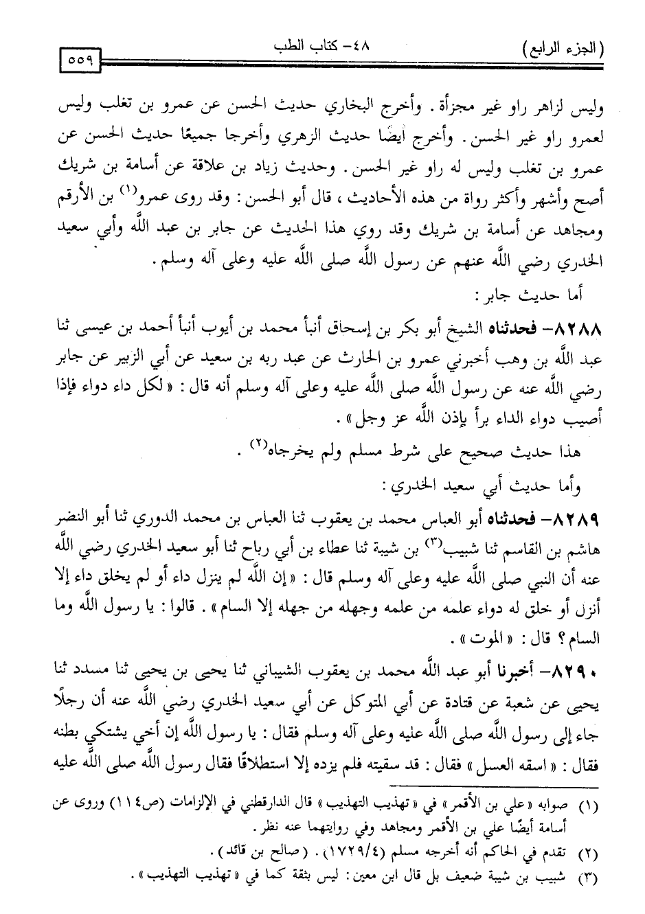 8290 - أَخْبَرَنَا أَبُو عَبْدِ اللَّهِ مُحَمَّدُ بْنُ يَعْقُوبَ الشَّيْبَانِيُّ ، ثَنَا يَحْيَى بْنُ مُحَمَّدِ بْنِ يَحْيَى ، ثَنَا مُسَدَّدٌ ، ثَنَا يَحْيَى ، عَنْ شُعْبَةَ ، عَنْ قَتَادَةَ ، عَنْ أَبِي الْمُتَوَكِّلِ ، عَنْ أَبِي سَعِيدٍ الْخُدْرِيِّ رَضِيَ اللَّهُ عَنْهُ ، أَنَّ رَجُلًا جَاءَ إِلَى رَسُولِ اللَّهِ صَلَّى اللَّهُ عَلَيْهِ وَسَلَّمَ ، فَقَالَ: يَا رَسُولَ اللَّهِ إِنَّ أَخِي يَشْتَكِي بَطْنَهُ ، فَقَالَ: " اسْقِهِ الْعَسَلَ " فَقَالَ: قَدْ سَقَيْتُهُ فَلَمْ يَزِدْهُ إِلَّا اسْتِطْلَاقًا ، فَقَالَ رَسُولُ اللَّهِ صَلَّى اللَّهُ عَلَيْهِ -[560]- وَسَلَّمَ فِي الثَّالِثَةِ أَوِ الرَّابِعَةِ: " صَدَقَ اللَّهُ ، وَكَذَبَ بَطْنُ أَخِيكَ " فَذَهَبَ فَسَقَاهُ فَبَرَأَ