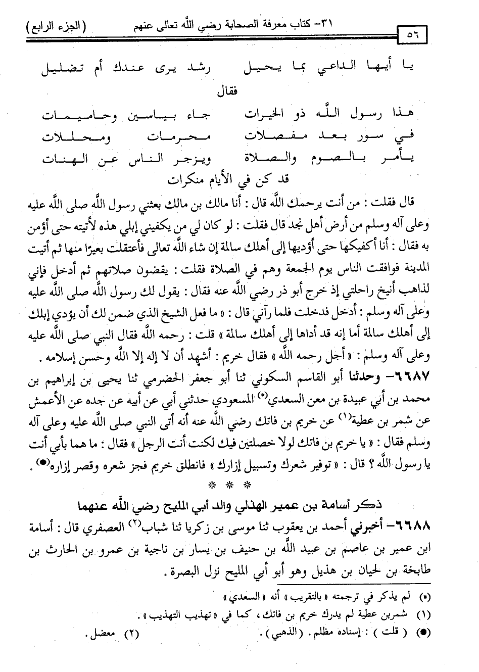 6688 - أَخْبَرَنِي أَحْمَدُ بْنُ يَعْقُوبَ ، ثَنَا مُوسَى بْنُ زَكَرِيَّا ، ثَنَا شَبَّابٌ الْعُصْفُرِيُّ ، قَالَ: " أُسَامَةُ بْنُ عُمَيْرِ بْنِ عَاصِمِ بْنِ عُبَيْدِ اللَّهِ بْنِ حُنَيْفِ بْنِ يَسَارِ بْنِ نَاجِيَةَ بْنِ عَمْرِو بْنِ الْحَارِثِ بْنِ طَابِخَةَ بْنِ لِحْيَانَ بْنِ هُذَيْلٍ وَهُوَ أَبُو أَبِي الْمَلِيحِ نَزَلَ الْبَصْرَةَ "