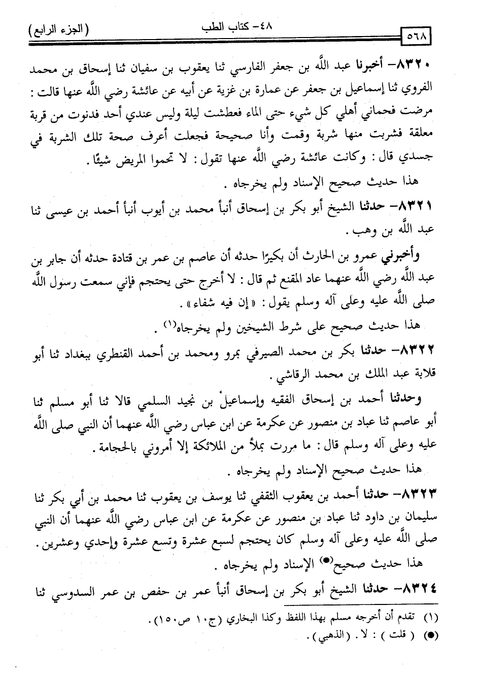 8322 - حَدَّثَنَا بَكْرُ بْنُ مُحَمَّدٍ الصَّيْرَفِيُّ ، بِمَرْوَ ، وَمُحَمَّدُ بْنُ أَحْمَدَ الْقَنْطَرِيُّ بِبَغْدَادَ ، قَالَا: ثَنَا أَبُو قِلَابَةَ عَبْدُ الْمَلِكِ بْنُ مُحَمَّدٍ الرَّقَاشِيُّ ، وَحَدَّثَنَا أَحْمَدُ بْنُ إِسْحَاقَ الْفَقِيهُ ، وَإِسْمَاعِيلُ بْنُ نُجَيْدٍ السُّلَمِيُّ ، قَالَا: ثَنَا أَبُو مُسْلِمٍ ، ثَنَا أَبُو عَاصِمٍ ، ثَنَا عَبَّادُ بْنُ مَنْصُورٍ ، عَنْ عِكْرِمَةَ ، عَنِ ابْنِ عَبَّاسٍ رَضِيَ اللَّهُ عَنْهُمَا ، أَنَّ النَّبِيَّ صَلَّى اللَّهُ عَلَيْهِ وَسَلَّمَ ، قَالَ: " مَا مَرَرْتُ بِمَلَأٍ مِنَ الْمَلَائِكَةِ إِلَّا أَمَرُونِي بِالْحِجَامَةِ "