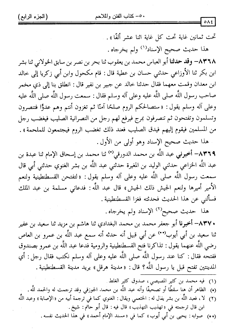 8370 - أَخْبَرَنَا أَبُو جَعْفَرٍ مُحَمَّدُ بْنُ مُحَمَّدٍ الْبَغْدَادِيُّ ، ثَنَا هَاشِمُ بْنُ مَرْثَدٍ ، ثَنَا سَعِيدُ بْنُ عُفَيْرٍ ، ثَنَا سَعِيدُ بْنُ أَبِي أَيُّوبَ ، عَنْ أَبِي قَبِيلٍ أَنَّهُ حَدَّثَهُ ، أَنَّهُ سَمِعَ عَبْدَ اللَّهِ بْنَ عَمْرِو بْنِ الْعَاصِ رَضِيَ اللَّهُ عَنْهُمَا ، يَقُولُ: تَذَاكَرْنَا فَتْحَ الْقُسْطَنْطِينِيَّةِ وَالرُّومِيَّةِ ، فَدَعَا عَبْدُ اللَّهِ بْنُ عَمْرٍو بِصُنْدُوقٍ فَفَتَحَهُ ، فَقَالَ: كُنَّا عِنْدَ رَسُولِ اللَّهِ صَلَّى اللَّهُ عَلَيْهِ وَسَلَّمَ نَكْتُبُ ، فَقَالَ رَجُلٌ: أَيُّ الْمَدِينَتَيْنِ تُفْتَحُ قَبْلُ يَا رَسُولَ اللَّهِ ؟ قَالَ: " مَدِينَةُ هِرَقْلَ " يُرِيدُ مَدِينَةَ الْقُسْطَنْطِينِيَّةِ ، -[585]-