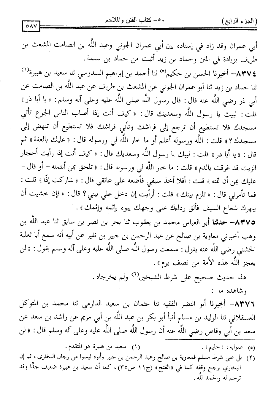 8374 - أَخْبَرَنَا الْحَسَنُ بْنُ حَكِيمٍ * ، ثَنَا أَحْمَدُ بْنُ إِبْرَاهِيمَ السَّدُوسِيُّ ** ، ثَنَا سَعِيدُ بْنُ هُبَيْرَةَ ، ثَنَا حَمَّادُ بْنُ زَيْدٍ ، ثَنَا أَبُو عِمْرَانَ الْجَوْنِيُّ ، عَنِ الْمُشَعَّثِ بْنِ طَرِيفٍ ، عَنْ عَبْدِ اللَّهِ بْنِ الصَّامِتِ ، عَنْ أَبِي ذَرٍّ رَضِيَ اللَّهُ عَنْهُ ، قَالَ: قَالَ رَسُولُ اللَّهِ صَلَّى اللَّهُ عَلَيْهِ وَسَلَّمَ: " يَا أَبَا ذَرٍّ " قُلْتُ: لَبَّيْكَ يَا رَسُولَ اللَّهِ وَسَعْدَيْكَ ، قَالَ: " كَيْفَ أَنْتَ إِذَا أَصَابَ النَّاسَ جُوعٌ ، تَأْتِي مَسْجِدَكَ فَلَا تَسْتَطِيعُ أَنْ تَرْجِعَ إِلَى فِرَاشِكَ ، وَتَأْتِي فِرَاشَكَ فَلَا تَسْتَطِيعُ أَنْ تَنْهَضَ إِلَى مَسْجِدِكَ " قُلْتُ: اللَّهُ وَرَسُولُهُ أَعْلَمُ - أَوْ مَا خَارَ اللَّهُ لِي وَرَسُولُهُ ، قَالَ: " عَلَيْكَ بِالْعِفَّةِ " ثُمَّ قَالَ: " يَا أَبَا ذَرٍّ " قُلْتُ: لَبَّيْكَ يَا رَسُولَ اللَّهِ وَسَعْدَيْكَ ، قَالَ: " كَيْفَ أَنْتَ إِذَا رَأَيْتَ أَحْجَارَ الزَّيْتِ قَدْ عُرِّفَتْ بِالدَّمِ ؟ " قُلْتُ: مَا خَارَ اللَّهُ وَرَسُولُهُ ، قَالَ: " تَلْحَقُ بِمَنْ أَنْتَ مِنْهُ - أَوْ قَالَ: عَلَيْكَ بِمَنْ أَنْتَ مِنْهُ - " قُلْتُ: أَفَلَا آخُذُ سَيْفِي فَأَضَعُهُ عَلَى عَاتِقِي ؟ قَالَ: " شَارَكْتَ إِذًا " قُلْتُ: فَمَا تَأْمُرُنِي ؟ قَالَ: " تَلْزَمُ بَيْتَكَ " قُلْتُ: أَرَأَيْتَ إِنْ دَخَلَ عَلَيَّ بَيْتِي ؟ قَالَ: " فَإِنْ خَشِيتَ أَنْ يَبْهَرَكَ شُعَاعُ السَّيْفِ فَأَلْقِ رِدَاءَكَ عَلَى وَجْهِكَ يَبُوءُ بِإِثْمِهِ وَإِثْمِكَ "