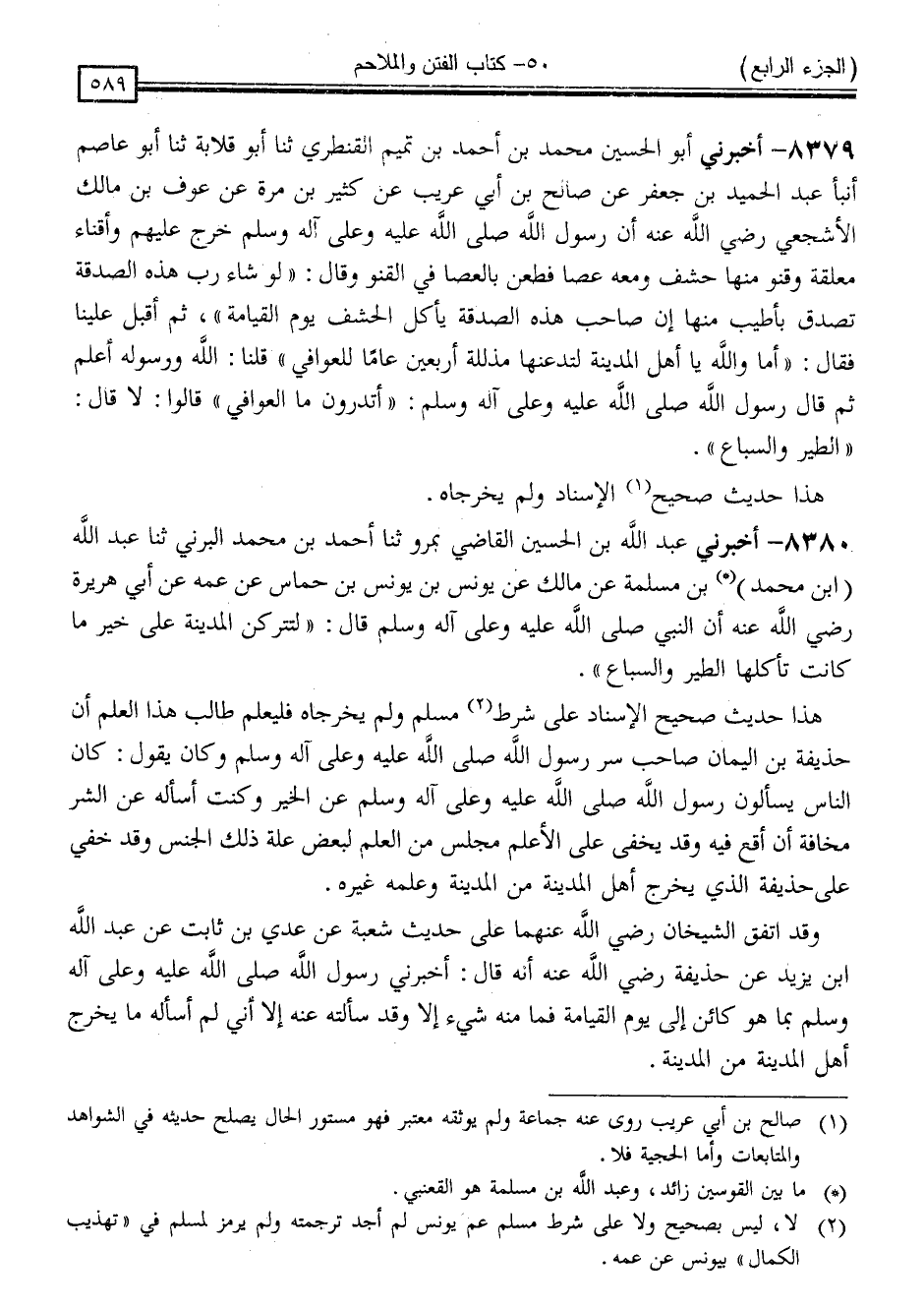 " هَذَا حَدِيثٌ صَحِيحُ الْإِسْنَادِ ، وَلَمْ يُخْرِجَاهُ ، فَلْيَعْلَمْ طَالِبُ هَذَا الْعِلْمِ أَنَّ حُذَيْفَةَ بْنَ الْيَمَانِ صَاحِبُ سِرِّ رَسُولِ اللَّهِ صَلَّى اللَّهُ عَلَيْهِ وَسَلَّمَ ، وَكَانَ يَقُولُ: كَانَ النَّاسُ يَسْأَلُونَ رَسُولَ اللَّهِ صَلَّى اللَّهُ عَلَيْهِ وَسَلَّمَ عَنِ الْخَيْرِ ، وَكُنْتُ أَسْأَلُهُ عَنِ الشَّرِّ مَخَافَةَ أَنْ أَقَعَ فِيهِ ، وَقَدْ يَخْفَى عَلَيَّ إِلَّا عَلِمَ مَجْلِسٍ مِنَ الْعِلْمِ لِبَعْضِ عِلَّةٍ ذَلِكَ الْجِنْسِ ، وَقَدْ خَفِيَ عَلَى حُذَيْفَةَ الَّذِي يُخْرِجُ أَهْلَ الْمَدِينَةِ مِنَ الْمَدِينَةِ وَعَلِمَهُ غَيْرُهُ "