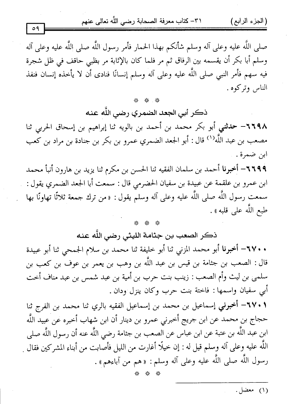 6698 - حَدَّثَنِي أَبُو بَكْرٍ مُحَمَّدُ بْنُ أَحْمَدَ بْنِ بَالَوَيْهِ ، ثَنَا إِبْرَاهِيمُ بْنُ إِسْحَاقَ الْحَرْبِيُّ ، ثَنَا مُصْعَبُ بْنُ عَبْدِ اللَّهِ ، قَالَ: " أَبُو الْجَعْدِ الضَّمْرِيُّ عَمْرُو بْنُ بَكْرِ بْنِ جُنَادَةَ بْنِ مُرَادِ بْنِ كَعْبِ بْنِ ضَمْرَةَ "