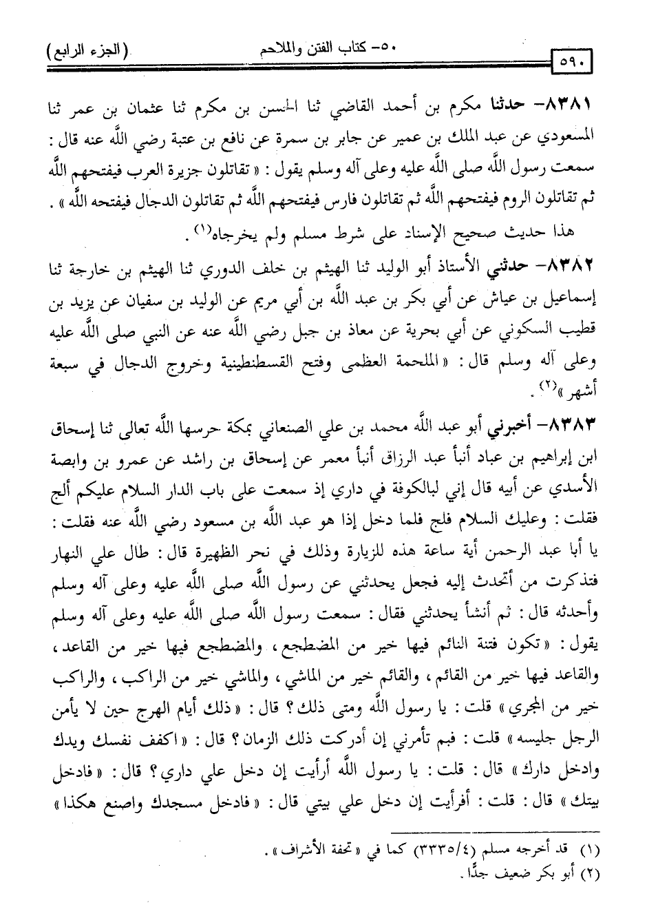 8383 - أَخْبَرَنِي أَبُو عَبْدِ اللَّهِ مُحَمَّدُ بْنُ عَلِيٍّ الصَّنْعَانِيُّ بِمَكَّةَ حَرَسَهَا اللَّهُ تَعَالَى ، ثَنَا إِسْحَاقُ بْنُ إِبْرَاهِيمَ بْنِ عَبَّادٍ ، أَنْبَأَ عَبْدُ الرَّزَّاقِ ، أَنْبَأَ مَعْمَرٌ ، عَنْ إِسْحَاقَ بْنِ رَاشِدٍ ، عَنْ عَمْرِو بْنِ وَابِصَةَ الْأَسَدِيِّ ، عَنْ أَبِيهِ ، قَالَ: إِنِّي لَبِالْكُوفَةِ فِي دَارِي ، إِذْ سَمِعْتُ عَلَى بَابِ الدَّارِ: السَّلَامُ عَلَيْكُمْ أَلِجُ ؟ فَقُلْتُ: وَعَلَيْكَ السَّلَامُ فَلُجَّ ، فَلَمَّا دَخَلَ إِذَا هُوَ عَبْدُ اللَّهِ بْنُ مَسْعُودٍ رَضِيَ اللَّهُ عَنْهُ ، فَقُلْتُ: يَا أَبَا عَبْدِ الرَّحْمَنِ أَيَّةُ سَاعَةٍ هَذِهِ لِلزِّيَارَةِ - وَذَلِكَ فِي نَحْرِ الظَّهِيرَةِ - قَالَ: طَالَ عَلَيَّ النَّهَارُ ، فَتَذَكَّرْتُ مَنْ أَتَحَدَّثُ إِلَيْهِ فَجَعَلَ يُحَدِّثُنِي عَنْ رَسُولِ اللَّهِ صَلَّى اللَّهُ عَلَيْهِ وَسَلَّمَ وَأُحَدِّثُهُ ، قَالَ: ثُمَّ أَنْشَأَ يُحَدِّثُنِي ، فَقَالَ: سَمِعْتُ رَسُولَ اللَّهِ صَلَّى اللَّهُ عَلَيْهِ وَسَلَّمَ ، يَقُولُ: " تَكُونُ فِتْنَةٌ النَّائِمُ فِيهَا خَيْرٌ مِنَ الْمُضْطَجِعِ ، وَالْمُضْطَجِعُ فِيهَا خَيْرٌ مِنَ الْقَاعِدِ ، وَالْقَاعِدُ فِيهَا خَيْرٌ مِنَ الْقَائِمِ ، وَالْقَائِمُ خَيْرٌ مِنَ الْمَاشِي ، وَالْمَاشِي خَيْرٌ مِنَ الرَّاكِبِ ، وَالرَّاكِبُ خَيْرٌ مِنَ الْمُجْرِي " ، قُلْتُ: يَا رَسُولَ اللَّهِ وَمَتَى ذَلِكَ ؟ قَالَ: " ذَلِكَ أَيَّامَ الْهَرْجِ حِينَ لَا يَأْمَنُ الرَّجُلُ جَلِيسَهُ " قُلْتُ: فَبِمَ تَأْمُرُنِي إِنْ أَدْرَكْتُ ذَلِكَ الزَّمَانَ ؟ قَالَ: " اكْفُفْ نَفْسَكَ وَيَدَكَ وَادْخُلْ دَارَكَ " قَالَ: قُلْتُ: يَا رَسُولَ اللَّهِ أَرَأَيْتَ إِنْ دَخَلَ عَلَيَّ دَارِي ؟ قَالَ: " فَادْخُلْ بَيْتَكَ " قَالَ: قُلْتُ: أَفَرَأَيْتَ إِنْ دَخَلَ عَلَيَّ بَيْتِي ؟ قَالَ: " فَادْخُلْ مَسْجِدَكَ وَاصْنَعْ هَكَذَا -[591]- - وَقَبَضَ بِيَمِينِهِ عَلَى الْكُوعِ - وَقُلْ رَبِّيَ اللَّهُ حَتَّى تَمُوتَ عَلَى ذَلِكَ "