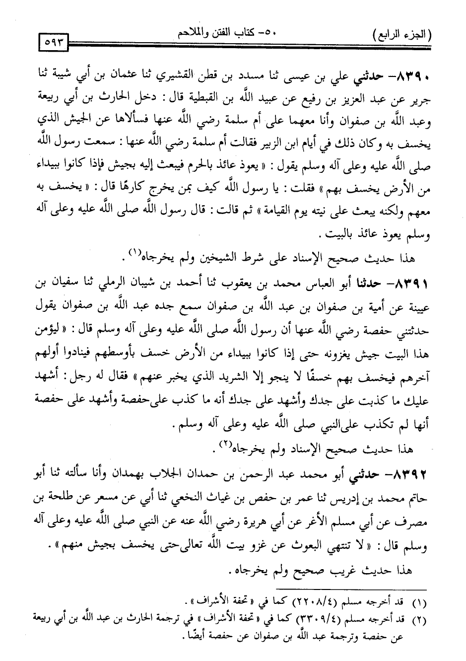 8391 - حَدَّثَنَا أَبُو الْعَبَّاسِ مُحَمَّدُ بْنُ يَعْقُوبَ ، ثَنَا أَحْمَدُ بْنُ شَيْبَانَ الرَّمْلِيُّ ، ثَنَا سُفْيَانُ بْنُ عُيَيْنَةَ ، عَنْ أُمَيَّةَ بْنِ صَفْوَانَ بْنِ عَبْدِ اللَّهِ بْنِ صَفْوَانَ ، سَمِعَ جَدَّهُ عَبْدَ اللَّهِ بْنَ صَفْوَانَ ، يَقُولُ: حَدَّثَتْنِي حَفْصَةُ رَضِيَ اللَّهُ عَنْهَا ، أَنَّ رَسُولَ اللَّهِ صَلَّى اللَّهُ عَلَيْهِ وَسَلَّمَ ، قَالَ: " لَيَؤُمَّنَّ هَذَا الْبَيْتَ جَيْشٌ يَغْزُونَهُ ، حَتَّى إِذَا كَانُوا بِبَيْدَاءَ مِنَ الْأَرْضِ خُسِفَ بِأَوْسَطِهِمْ ، فَيُنَادُوا أَوَّلُهُمْ آخِرُهُمْ ، فَيُخْسَفُ بِهِمْ خَسٍفًا لَا يَنْجُو إِلَّا الشَّرِيدُ الَّذِي يُخْبِرُ عَنْهُمْ " فَقَالَ لَهُ رَجُلٌ: أَشْهَدُ عَلَيْكَ مَا كَذَبْتَ عَلَى جَدِّكَ ، وَأَشْهَدُ عَلَى جَدِّكَ أَنَّهُ مَا كَذَبَ عَلَى حَفْصَةَ ، وَأَشْهَدُ عَلَى حَفْصَةَ أَنَّهَا لَمْ تَكْذِبْ عَلَى النَّبِيِّ صَلَّى اللَّهُ عَلَيْهِ وَسَلَّمَ