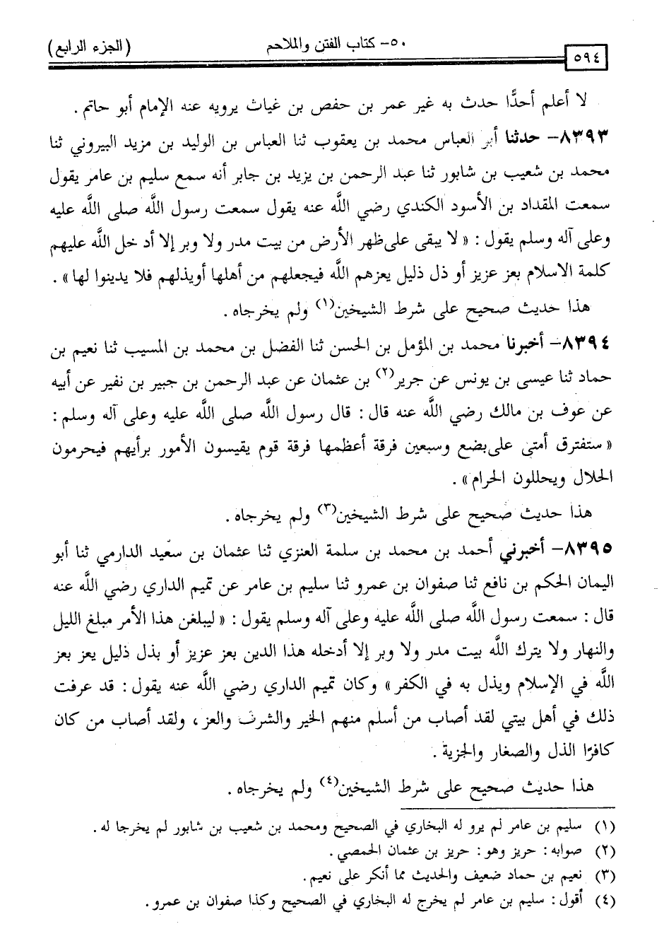 8395 - أَخْبَرَنِي أَحْمَدُ بْنُ مُحَمَّدِ بْنِ سَلَمَةَ الْعَنَزِيُّ ، ثَنَا عُثْمَانُ بْنُ سَعِيدٍ الدَّارِمِيُّ ، ثَنَا أَبُو الْيَمَانِ الْحَكَمُ بْنُ نَافِعٍ ، ثَنَا صَفْوَانُ بْنُ عَمْرٍو ، ثَنَا سُلَيْمُ بْنُ عَامِرٍ ، عَنْ تَمِيمٍ الدَّارِيِّ رَضِيَ اللَّهُ عَنْهُ ، قَالَ: سَمِعْتُ رَسُولَ اللَّهِ صَلَّى اللَّهُ عَلَيْهِ وَسَلَّمَ ، يَقُولُ: " لَيَبْلُغَنَّ هَذَا الْأَمْرُ مَبْلَغَ اللَّيْلِ وَالنَّهَارِ ، وَلَا يَتْرُكُ اللَّهُ بَيْتَ مَدَرٍ وَلَا وَبَرٍ إِلَّا أَدْخَلَهُ هَذَا الدِّينَ بِعِزِّ عَزِيزٍ ، أَوْ بِذُلِّ ذَلِيلٍ ، يُعِزُّ بِعِزِّ اللَّهِ فِي الْإِسْلَامِ ، وَيُذِلَّ بِهِ فِي الْكُفْرِ " وَكَانَ تَمِيمٌ الدَّارِيُّ رَضِيَ اللَّهُ عَنْهُ ، يَقُولُ: " قَدْ عَرَفْتُ ذَلِكَ فِي أَهْلِ بَيْتِي لَقَدْ أَصَابَ مَنْ أَسْلَمَ مِنْهُمُ الْخَيْرَ وَالشَّرَفَ وَالْعِزَّ ، وَلَقَدْ أَصَابَ مَنْ كَانَ كَافِرًا الذُّلَّ وَالصَّغَارَ وَالْجِزْيَةَ "