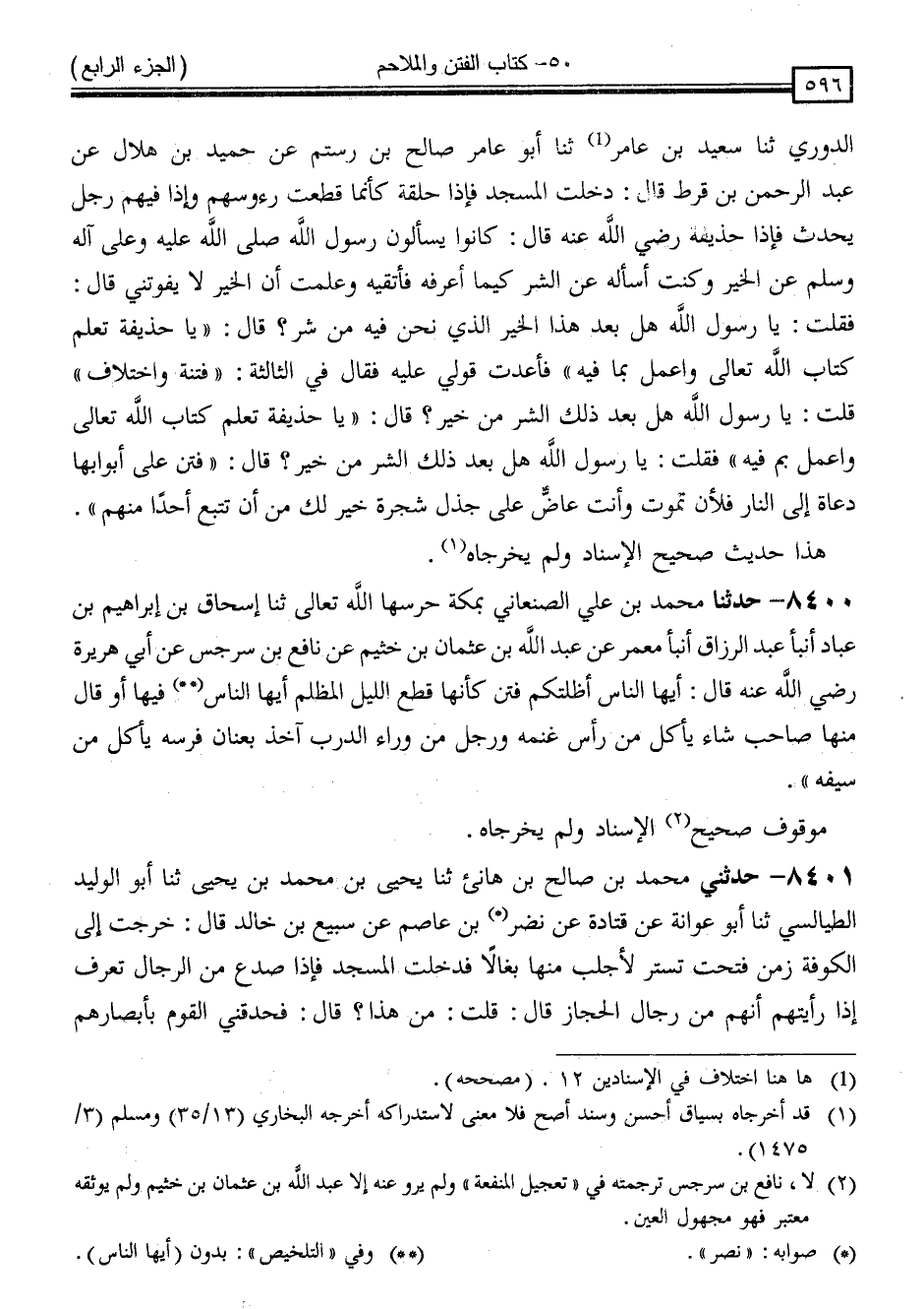 8401 - حَدَّثَنِي مُحَمَّدُ بْنُ صَالِحِ بْنِ هَانِئٍ ، ثَنَا يَحْيَى بْنُ مُحَمَّدِ بْنِ يَحْيَى ، ثَنَا أَبُو الْوَلِيدِ الطَّيَالِسِيُّ ، ثَنَا أَبُو عَوَانَةَ ، عَنْ قَتَادَةَ ، عَنْ نَصْرِ بْنِ عَاصِمٍ ، عَنْ سُبَيْعِ بْنِ خَالِدٍ ، قَالَ: خَرَجْتُ إِلَى الْكُوفَةِ زَمَنَ فُتِحَتْ تُسْتَرُ لِأَجْلِبَ مِنْهَا بِغَالًا ، فَدَخَلْتُ الْمَسْجِدَ فَإِذَا صَدْعٌ مِنَ الرِّجَالِ تَعْرِفُ إِذَا رَأَيْتَهُمْ أَنَّهُمْ مِنْ رِجَالِ الْحِجَازِ ، قَالَ: قُلْتُ: مَنْ هَذَا ؟ قَالَ: فَحَدَّقَنِي الْقَوْمُ بِأَبْصَارِهِمْ ، -[597]- وَقَالُوا: مَا تَعْرِفُ هَذَا ؟ هَذَا حُذَيْفَةُ صَاحِبُ سِرِّ رَسُولِ اللَّهِ صَلَّى اللَّهُ عَلَيْهِ وَسَلَّمَ ، قَالَ: فَقَالَ حُذَيْفَةُ رَضِيَ اللَّهُ عَنْهُ: إِنَّ النَّاسَ كَانُوا يَسْأَلُونَ رَسُولَ اللَّهِ صَلَّى اللَّهُ عَلَيْهِ وَسَلَّمَ عَنِ الْخَيْرِ وَكُنْتُ أَسْأَلُهُ عَنِ الشَّرِّ ، قَالَ: قُلْتُ: يَا رَسُولَ اللَّهِ ، أَرَأَيْتَ هَذَا الْخَيْرَ الَّذِي أَعْطَانَا اللَّهُ يَكُونُ بَعْدَهُ شَرٌّ كَمَا كَانَ قَبْلَهُ ؟ قَالَ: " نَعَمْ " قُلْتُ: يَا رَسُولَ اللَّهِ ، فَمَا الْعِصْمَةُ مِنْ ذَلِكَ ؟ قَالَ: " السَّيْفُ " قُلْتُ: وَهَلْ لِلسَّيْفِ مِنْ بَقِيَّةٍ ؟ قَالَ: " نَعَمْ " قَالَ: قُلْتُ: ثُمَّ مَاذَا ؟ قَالَ: " ثُمَّ هُدْنَةٌ عَلَى دَخَنٍ " قَالَ: " جَمَاعَةٌ عَلَى فِرْقَةٍ ، فَإِنْ كَانَ لِلَّهِ عَزَّ وَجَلَّ يَوْمَئِذٍ خَلِيفَةٌ ضَرَبَ ظَهْرَكَ وَأَخَذَ مَالَكَ ، فَاسْمَعْ وَأَطِعْ وَإِلَّا فَمُتْ عَاضًّا بِجِذْلِ شَجَرَةٍ " قَالَ: قُلْتُ: ثُمَّ مَاذَا ؟ قَالَ: " يَخْرُجُ الدَّجَّالُ وَمَعَهُ نَهْرٌ وَنَارٌ ، فَمَنْ وَقَعَ فِي نَارِهِ أَجَرَهُ وَحَطَّ وِزْرَهُ ، وَمَنْ وَقَعَ فِي نَهْرِهِ وَجَبَ وِزْرُهُ وَحُطَّ أَجْرُهُ " قُلْتُ: ثُمَّ مَاذَا ؟ قَالَ: " ثُمَّ إِنَّمَا هِيَ قِيَامُ السَّاعَةِ "