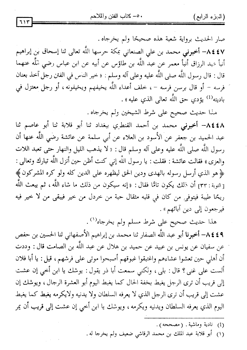 8447 - أَخْبَرَنِي مُحَمَّدُ بْنُ عَلِيٍّ الصَّنْعَانِيُّ ، بِمَكَّةَ حَرَسَهَا اللَّهُ تَعَالَى ، ثَنَا إِسْحَاقُ بْنُ إِبْرَاهِيمَ ، أَنْبَأَ عَبْدُ الرَّزَّاقِ ، أَنْبَأَ مَعْمَرٌ ، عَنْ عَبْدِ اللَّهِ بْنِ طَاوُسٍ ، عَنْ أَبِيهِ ، عَنِ ابْنِ عَبَّاسٍ رَضِيَ اللَّهُ عَنْهُمَا ، قَالَ: قَالَ رَسُولُ اللَّهِ صَلَّى اللَّهُ عَلَيْهِ وَسَلَّمَ: " خَيْرُ النَّاسِ فِي الْفِتَنِ رَجُلٌ آخِذٌ بِعِنَانِ فَرَسِهِ - أَوْ قَالَ: بِرَسَنِ فَرَسِهِ - خَلْفَ أَعْدَاءِ اللَّهِ يُخِيفُهُمْ وَيُخِيفُونَهُ ، أَوْ رَجُلٌ مُعْتَزِلٌ فِي بَادِيَتِهِ يُؤَدِّي حَقَّ اللَّهِ تَعَالَى الَّذِي عَلَيْهِ "