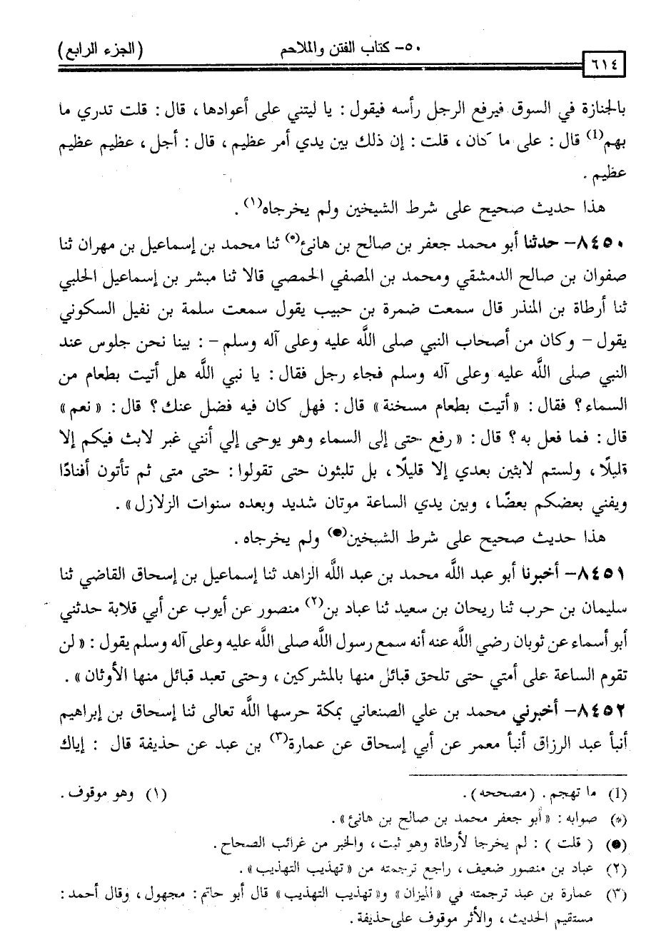 8450 - حَدَّثَنَا أَبُو مُحَمَّدِ بْنُ جَعْفَرِ بْنِ صَالِحِ بْنِ هَانِئٍ * ، ثَنَا مُحَمَّدُ بْنُ إِسْمَاعِيلَ بْنِ مِهْرَانَ ، ثَنَا صَفْوَانُ بْنُ صَالِحٍ الدِّمَشْقِيُّ ، وَمُحَمَّدُ بْنُ الْمُصَفَّى الْحِمْصِيُّ ، قَالَا: ثَنَا مُبَشِّرُ بْنُ إِسْمَاعِيلَ الْحَلَبِيُّ ، ثَنَا أَرْطَأَةُ بْنُ الْمُنْذِرِ ، قَالَ: سَمِعْتُ ضَمْرَةَ بْنَ حَبِيبٍ ، يَقُولُ: سَمِعْتُ سَلَمَةَ بْنَ نُفَيْلٍ السَّكُونِيَّ ، يَقُولُ وَكَانَ مِنْ أَصْحَابِ النَّبِيِّ صَلَّى اللَّهُ عَلَيْهِ وَسَلَّمَ: بَيْنَا نَحْنُ جُلُوسٌ عِنْدَ النَّبِيِّ صَلَّى اللَّهُ عَلَيْهِ وَسَلَّمَ فَجَاءَ رَجُلٌ ، فَقَالَ: يَا نَبِيَّ اللَّهِ ، هَلْ أُتِيتَ بِطَعَامٍ مِنَ السَّمَاءِ ؟ فَقَالَ: " أُتِيتُ بِطَعَامٍ مُسْخِنَةٍ " ، قَالَ: فَهَلْ كَانَ فِيهِ فَضْلٌ عَنْكَ ؟ قَالَ: " نَعَمْ " ، قَالَ: فَمَا فُعِلَ بِهِ ؟ قَالَ: " رُفِعَ حَتَّى إِلَى السَّمَاءِ وَهُوَ يُوحِي إِلَيَّ أَنَّنِي غَيْرُ لَابِثٍ فِيكُمْ إِلَّا قَلِيلًا ، وَلَسْتُمْ لَابِثِينَ بَعْدِي إِلَّا قَلِيلًا ، بَلْ تَلْبَثُونَ حَتَّى تَقُولُوا حَتَّى مَتَى ، ثُمَّ تَأْتُونَ أَفْنَادًا ، وَيُفْنِي بَعْضُكُمْ بَعْضًا ، وَبَيْنَ يَدَيِ السَّاعَةِ مَوْتَانٌ شَدِيدٌ وَبَعْدَهُ سَنَوَاتُ الزَّلَازِلِ "