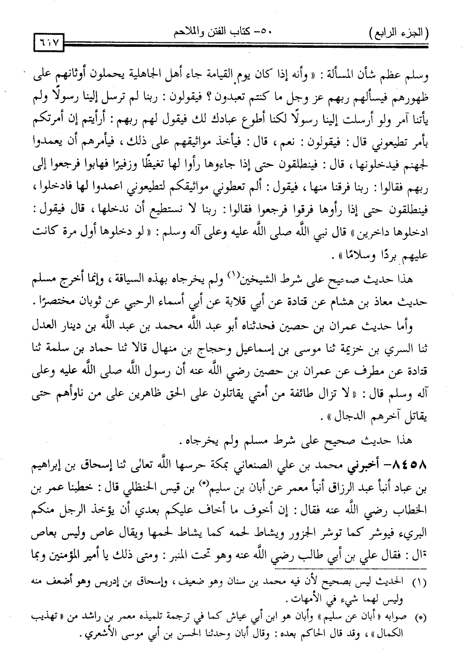 - فَحَدَّثْنَاهُ أَبُو عَبْدِ اللَّهِ مُحَمَّدُ بْنُ عَبْدِ اللَّهِ بْنِ دِينَارٍ الْعَدْلُ ، ثَنَا السَّرِيُّ بْنُ خُزَيْمَةَ ، ثَنَا مُوسَى بْنُ إِسْمَاعِيلَ ، وَحَجَّاجُ بْنُ مِنْهَالٍ ، قَالَا: ثَنَا حَمَّادُ بْنُ سَلَمَةَ ، ثَنَا قَتَادَةُ ، عَنْ مُطَرِّفٍ ، عَنْ عِمْرَانَ بْنِ حُصَيْنٍ رَضِيَ اللَّهُ عَنْهُ ، أَنَّ رَسُولَ اللَّهِ صَلَّى اللَّهُ عَلَيْهِ وَسَلَّمَ ، قَالَ: " لَا تَزَالُ طَائِفَةٌ مِنْ أُمَّتِي يُقَاتِلُونَ عَلَى الْحَقِّ ظَاهِرِينَ عَلَى مَنْ نَاوَأَهُمْ ، حَتَّى يُقَاتِلَ آخِرُهُمُ الدَّجَّالَ "