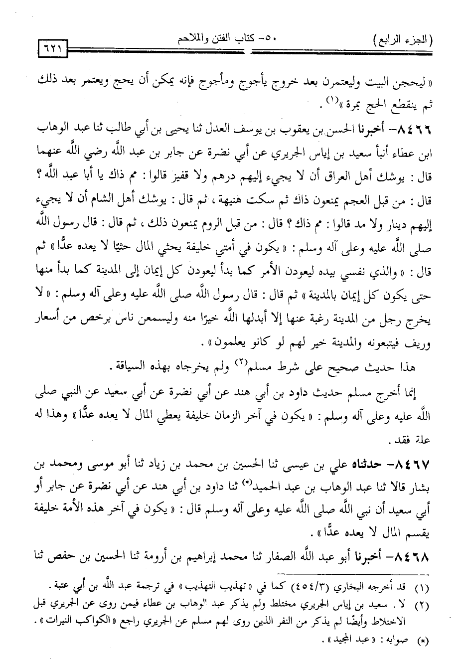 - إِنَّمَا أَخْرَجَ مُسْلِمٌ حَدِيثَ دَاوُدَ بْنِ أَبِي هِنْدٍ ، عَنْ أَبِي نَضْرَةَ ، عَنْ أَبِي سَعِيدٍ ، عَنِ النَّبِيِّ صَلَّى اللَّهُ عَلَيْهِ وَسَلَّمَ: " يَكُونُ فِي آخِرِ الزَّمَانِ خَلِيفَةٌ يُعْطِي الْمَالَ لَا يَعُدُّهُ عَدًّا " وَهَذَا لَهُ عِلَّةٌ فَقَدْ