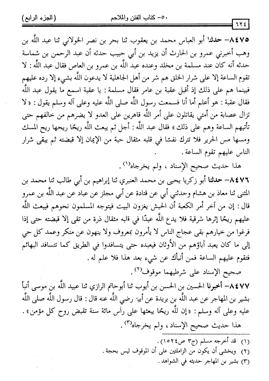 8476 - حَدَّثَنَا أَبُو زَكَرِيَّا يَحْيَى بْنُ مُحَمَّدٍ الْعَنْبَرِيُّ ، ثَنَا إِبْرَاهِيمُ بْنُ أَبِي طَالِبٍ ، ثَنَا مُحَمَّدُ بْنُ الْمُثَنَّى ، ثَنَا مُعَاذُ بْنُ هِشَامٍ ، وَحَدَّثَنِي أَبِي ، عَنْ قَتَادَةَ ، عَنْ أَبِي مِجْلَزٍ ، عَنْ قَيْسِ بْنِ عَبَّادٍ ، عَنْ عَبْدِ اللَّهِ بْنِ عَمْرٍو ، قَالَ: " إِنَّ مِنْ آخِرِ أَمْرِ الْكَعْبَةِ أَنَّ الْحَبَشَ يَغْزُونَ الْبَيْتَ فَيَتَوَجَّهُ الْمُسْلِمُونَ نَحْوَهُمْ ، فَيَبْعَثُ اللَّهُ عَلَيْهِمْ رِيحًا أَثَرُهَا شَرْقِيَّةٌ ، فَلَا يَدَعُ اللَّهُ عَبْدًا فِي قَلْبِهِ مِثْقَالُ ذَرَّةٍ مِنْ تُقًى إِلَّا قَبَضَتْهُ ، حَتَّى إِذَا فَرَغُوا مِنْ خِيَارِهِمْ بَقِيَ عَجَاجٌ مِنَ النَّاسِ ، لَا يَأْمُرُونَ بِمَعْرُوفٍ وَلَا يَنْهَوْنَ عَنْ مُنْكَرٍ ، وَعَمَدَ كُلُّ حَيٍّ إِلَى مَا كَانَ يَعْبُدُ آبَاؤُهُمْ مِنَ الْأَوْثَانِ فَيَعْبُدُهُ ، حَتَّى يَتَسَافَدُوا فِي الطُّرُقِ كَمَا تَتَسَافَدُ الْبَهَائِمُ ، فَتَقُومُ عَلَيْهِمُ السَّاعَةُ ، فَمَنْ أَنْبَأَكَ عَنْ شَيْءٍ بَعْدَ هَذَا فَلَا عِلْمَ لَهُ " صَحِيحُ الْإِسْنَادِ عَلَى شَرْطِهِمَا مَوْقُوفٌ