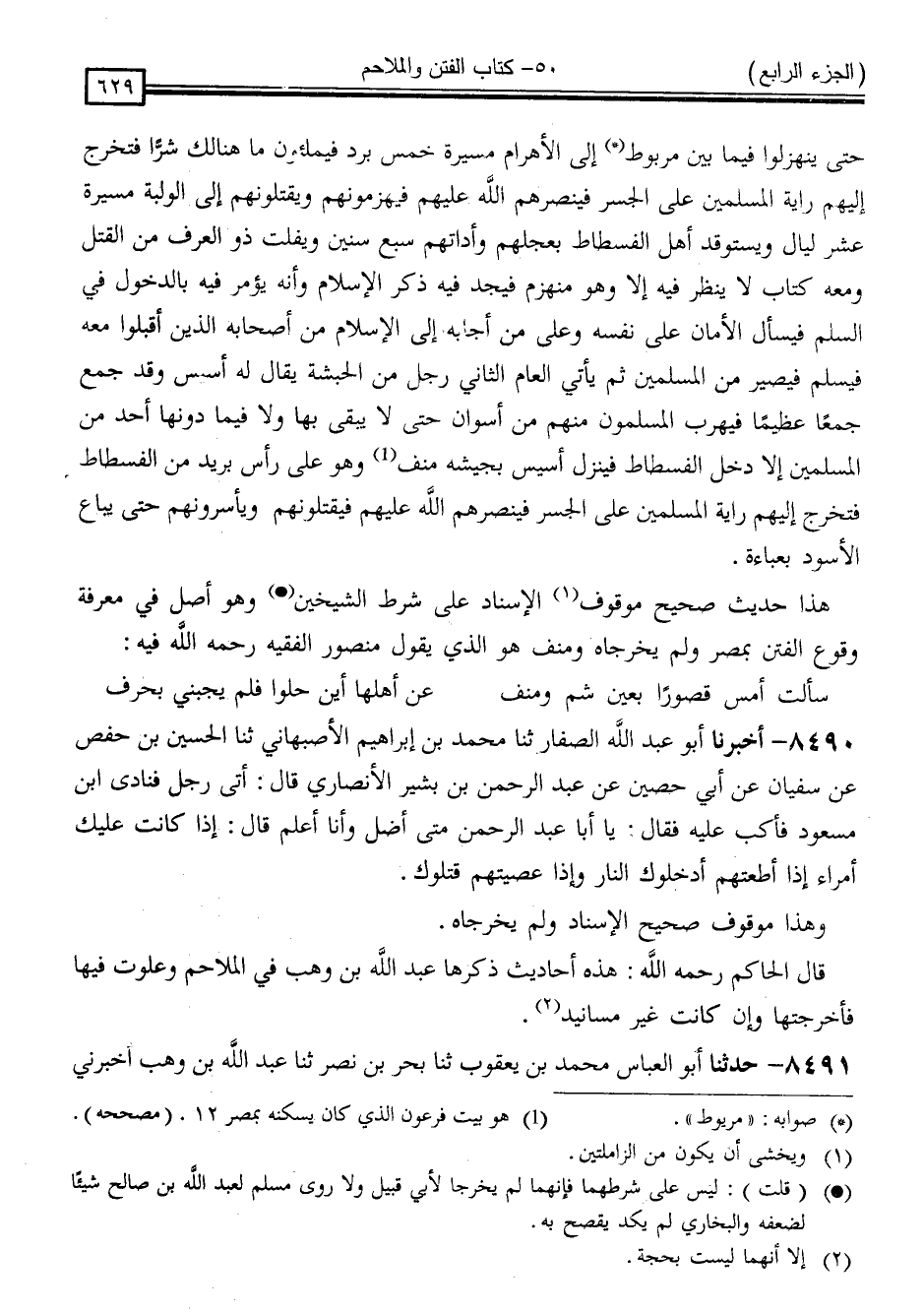 قَالَ الْحَاكِمُ رَحِمَهُ اللَّهُ: " هَذِهِ أَحَادِيثُ ذَكَرَهَا عَبْدُ اللَّهِ بْنُ وَهْبٍ فِي الْمَلَاحِمِ ، وَعَلَوْتُ فِيهَا فَأَخْرَجْتُهَا ، وَإِنْ كَانَتْ غَيْرَ مَسَانِيدَ "