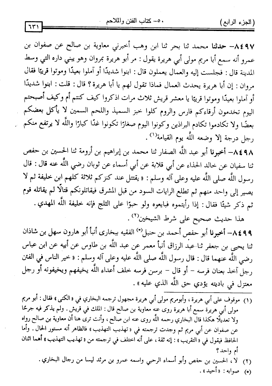 8498 - أَخْبَرَنَا أَبُو عَبْدِ اللَّهِ الصَّفَّارُ ، ثَنَا مُحَمَّدُ بْنُ إِبْرَاهِيمَ بْنِ أَرُومَةَ ، ثَنَا الْحُسَيْنُ بْنُ حَفْصٍ ، ثَنَا سُفْيَانُ ، عَنْ خَالِدٍ الْحَذَّاءِ ، عَنْ أَبِي قِلَابَةَ ، عَنْ أَبِي أَسْمَاءَ ، عَنْ ثَوْبَانَ رَضِيَ اللَّهُ عَنْهُ ، قَالَ: قَالَ رَسُولُ اللَّهِ صَلَّى اللَّهُ عَلَيْهِ وَسَلَّمَ: " يَقْتَتِلُ عِنْدَ كَنْزِكُمْ ثَلاثَةٌ ، كُلُّهُمُ ابْنُ خَلِيفَةَ ، ثُمَّ لاَ يَصِيرُ إِلَى وَاحِدٍ مِنْهُمْ ، ثُمَّ تَطْلُعُ الرَّايَاتُ السُّودُ مِنْ قِبَلِ الْمَشْرِقِ ، فَيُقَاتِلُونَكُمْ قِتَالا لَمْ يُقَاتِلْهُ قَوْمٌ ، ثُمَّ ذَكَرَ شَيْئًا ، فَقَالَ : إِذَا رَأَيْتُمُوهُ فَبَايِعُوهُ ، وَلَوْ حَبْوًا عَلَى الثَّلْجِ ، فَإِنَّهُ خَلِيفَةُ اللَّهِ الْمَهْدِيُّ "