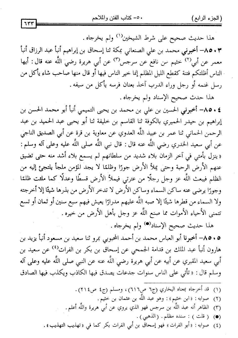 8504 - أَخْبَرَنِي الْحُسَيْنُ بْنُ عَلِيِّ بْنِ مُحَمَّدِ بْنِ يَحْيَى التَّمِيمِيُّ ، أَنْبَأَ أَبُو مُحَمَّدٍ الْحَسَنُ بْنُ إِبْرَاهِيمَ بْنِ حَيْدَرَ الْحِمْيَرِيُّ ، بِالْكُوفَةِ ، ثَنَا الْقَاسِمُ بْنُ خَلِيفَةَ ، ثَنَا أَبُو يَحْيَى عَبْدُ الْحَمِيدِ بْنُ عَبْدِ الرَّحْمَنِ الْحِمَّانِيُّ ، ثَنَا عُمَرُ بْنُ عُبَيْدِ اللَّهِ الْعَدَوِيُّ ، عَنْ مُعَاوِيَةَ بْنِ قُرَّةَ ، عَنْ أَبِي الصِّدِّيقِ النَّاجِيِّ ، عَنْ أَبِي سَعِيدٍ الْخُدْرِيِّ رَضِيَ اللَّهُ عَنْهُ ، قَالَ: قَالَ نَبِيُّ اللَّهِ صَلَّى اللَّهُ عَلَيْهِ وَسَلَّمَ: " يَنْزِلُ بِأُمَّتِي فِي آخِرِ الزَّمَانِ بَلَاءٌ شَدِيدٌ مِنْ سُلْطَانِهِمْ لَمْ يُسْمَعْ بَلَاءٌ أَشَدُّ مِنْهُ ، حَتَّى تَضِيقَ عَنْهُمُ الْأَرْضُ الرَّحْبَةُ ، وَحَتَّى يُمْلَأَ الْأَرْضُ جَوْرًا وَظُلْمًا ، لَا يَجِدُ الْمُؤْمِنُ مَلْجَأً يَلْتَجِئُ إِلَيْهِ مِنَ الظُّلْمِ ، فَيَبْعَثُ اللَّهُ عَزَّ وَجَلَّ رَجُلًا مِنْ عِتْرَتِي ، فَيَمْلَأُ الْأَرْضَ قِسْطًا وَعَدْلًا ، كَمَا مُلِئَتْ ظُلْمًا وَجَوْرًا ، يَرْضَى عَنْهُ سَاكِنُ السَّمَاءِ وَسَاكِنُ الْأَرْضِ ، لَا تَدَّخِرُ الْأَرْضُ مِنْ بَذْرِهَا شَيْئًا إِلَّا أَخْرَجَتْهُ ، وَلَا السَّمَاءُ مِنْ قَطْرِهَا شَيْئًا إِلَّا صَبَّهُ اللَّهُ عَلَيْهِمْ مِدْرَارًا ، يَعِيشُ فِيهَا سَبْعَ سِنِينَ أَوْ ثَمَانِ أَوْ تِسْعَ ، تَتَمَنَّى الْأَحْيَاءُ الْأَمْوَاتَ مِمَّا صَنَعَ اللَّهُ عَزَّ وَجَلَّ بِأَهْلِ الْأَرْضِ مِنْ خَيْرِهِ "