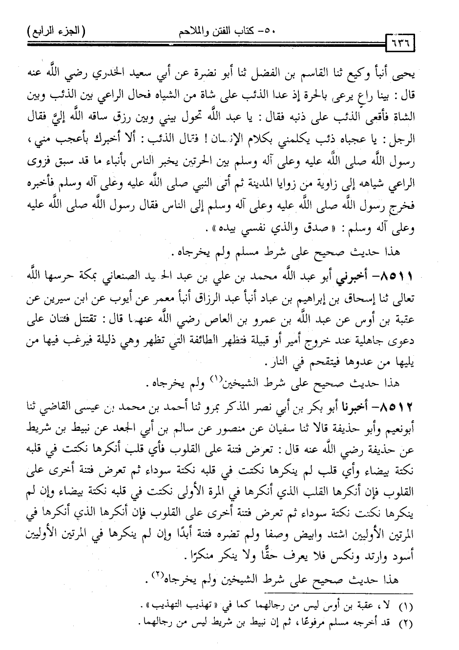 8512 - أَخْبَرَنَا أَبُو بَكْرِ بْنُ أَبِي نَصْرٍ الْمُذَكِّرُ ، بِمَرْوَ ، ثَنَا أَحْمَدُ بْنُ مُحَمَّدِ بْنِ عِيسَى الْقَاضِي ، ثَنَا أَبُو نُعَيْمٍ ، وَأَبُو حُذَيْفَةَ ، قَالَا: ثَنَا سُفْيَانُ ، عَنْ مَنْصُورٍ ، عَنْ سَالِمِ بْنِ أَبِي الْجَعْدِ ، عَنْ نُبَيْطِ بْنِ شَرِيطٍ ، عَنْ حُذَيْفَةَ رَضِيَ اللَّهُ عَنْهُ ، قَالَ: " تُعْرَضُ فِتْنَةٌ عَلَى الْقُلُوبِ ، فَأَيُّ قَلْبٍ أَنْكَرَهَا نُكِتَتْ فِي قَلْبِهِ نُكْتَةٌ بَيْضَاءُ ، وَأَيُّ قَلْبٍ لَمْ يُنْكِرْهَا نُكِتَتْ فِي قَلْبِهِ نُكْتَةٌ سَوْدَاءُ ، ثُمَّ تُعْرَضُ فِتْنَةٌ أُخْرَى عَلَى الْقُلُوبِ ، فَإِنْ أَنْكَرَهَا الْقَلْبُ الَّذِي أَنْكَرَهَا فِي الْمَرَّةِ الْأُولَى نُكِتَتْ فِي قَلْبِهِ نُكْتَةٌ بَيْضَاءُ ، وَإِنْ لَمْ يُنْكِرْهَا نُكِتَتْ نُكْتَةٌ سَوْدَاءُ ، ثُمَّ تُعْرَضُ فِتْنَةٌ أُخْرَى عَلَى الْقُلُوبِ ، فَإِنْ أَنْكَرَهَا الَّذِي أَنْكَرَهَا فِي الْمَرَّتَيْنِ الْأُولَيَيْنِ اشْتَدَّ وَابْيَضَّ وَصَفَا وَلَمْ تَضُرَّهُ فِتْنَةٌ أَبَدًا ، وَإِنْ لَمْ يُنْكِرْهَا فِي الْمَرَّتَيْنِ الْأُولَيَيْنِ اسْوَدَّ وَارْتَدَّ وَنَكَسَ فَلَا يَعْرِفُ حَقًّا وَلَا يُنْكِرُ مُنْكَرًا "