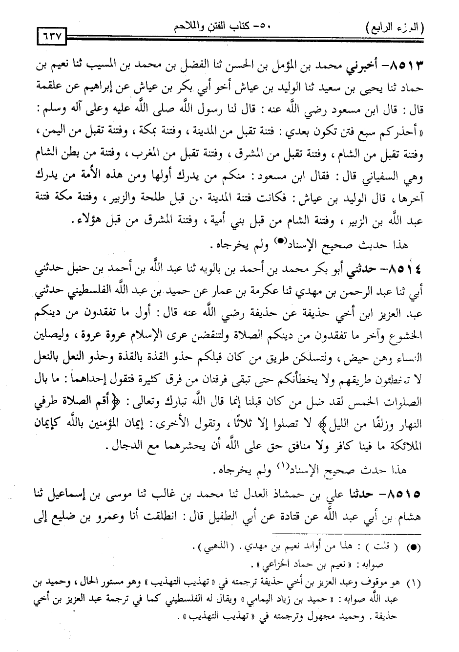8513 - أَخْبَرَنِي مُحَمَّدُ بْنُ الْمُؤَمَّلِ بْنِ الْحَسَنِ ، ثَنَا الْفَضْلُ بْنُ مُحَمَّدِ بْنِ الْمُسَيِّبِ ، ثَنَا نُعَيْمُ بْنُ حَمَّادٍ ، ثَنَا يَحْيَى بْنُ سَعِيدٍ ، ثَنَا الْوَلِيدُ بْنُ عَيَّاشٍ ، أَخُو أَبِي بَكْرِ بْنِ عَيَّاشٍ ، عَنْ إِبْرَاهِيمَ ، عَنْ عَلْقَمَةَ ، قَالَ: قَالَ ابْنُ مَسْعُودٍ رَضِيَ اللَّهُ عَنْهُ: قَالَ لَنَا رَسُولُ اللَّهِ صَلَّى اللَّهُ عَلَيْهِ وَسَلَّمَ: " أُحَذِّرُكُمْ سَبْعَ فِتَنٍ تَكُونُ بَعْدِي: فِتْنَةً تُقْبِلُ مِنَ الْمَدِينَةِ ، وَفِتْنَةً بِمَكَّةَ ، وَفِتْنَةً تُقْبِلُ مِنَ الْيَمَنِ ، وَفِتْنَةً تُقْبِلُ مِنَ الشَّامِ ، وَفِتْنَةً تُقْبِلُ مِنَ الْمَشْرِقِ ، وَفِتْنَةً تُقْبِلُ مِنَ الْمَغْرِبِ ، وَفِتْنَةً مِنْ بَطْنِ الشَّامِ وَهِيَ السُّفْيَانِيُّ " قَالَ: فَقَالَ ابْنُ مَسْعُودٍ: مِنْكُمْ مَنْ يُدْرِكُ أَوَّلَهَا ، وَمِنْ هَذِهِ الْأُمَّةِ مَنْ يُدْرِكُ آخِرَهَا ، قَالَ الْوَلِيدُ بْنُ عَيَّاشٍ: " فَكَانَتْ فِتْنَةُ الْمَدِينَةِ مِنْ قِبَلِ طَلْحَةَ وَالزُّبَيْرِ ، وَفِتْنَةُ مَكَّةَ فِتْنَةُ عَبْدِ اللَّهِ بْنِ الزُّبَيْرِ ، وَفِتْنَةُ الشَّامِ مِنْ قِبَلِ بَنِي أُمَيَّةَ ، وَفِتْنَةُ الْمَشْرِقِ مِنْ قِبَلِ هَؤُلَاءِ "