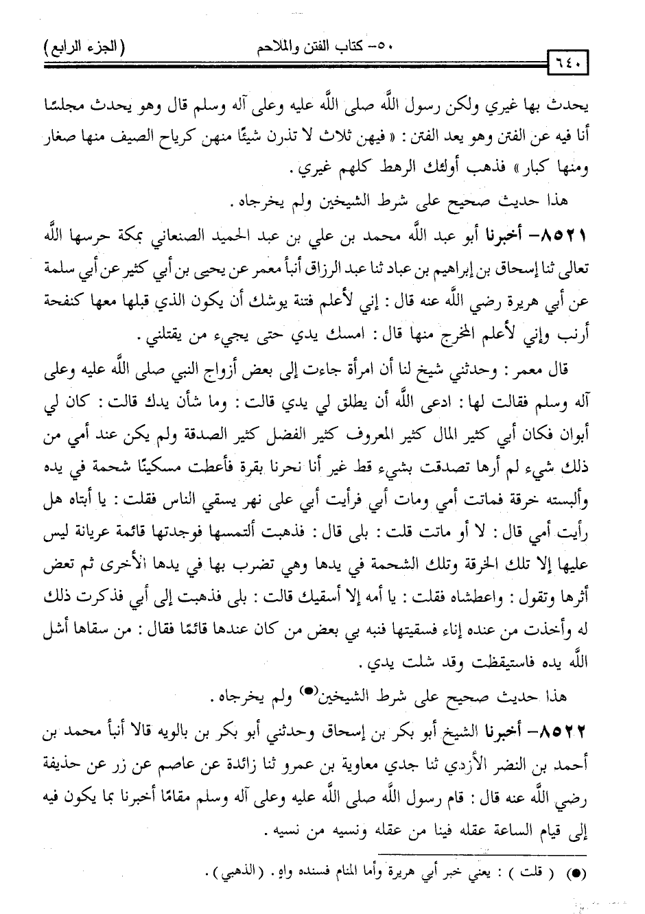8521 - أَخْبَرَنَا أَبُو عَبْدِ اللَّهِ مُحَمَّدُ بْنُ عَلِيِّ بْنِ عَبْدِ الْحَمِيدِ الصَّنْعَانِيُّ بِمَكَّةَ حَرَسَهَا اللَّهُ تَعَالَى ، ثَنَا إِسْحَاقُ بْنُ إِبْرَاهِيمَ بْنِ عَبَّادٍ ، ثَنَا عَبْدُ الرَّزَّاقِ ، أَنْبَأَ مَعْمَرٌ ، عَنْ يَحْيَى بْنِ أَبِي كَثِيرٍ ، عَنْ أَبِي سَلَمَةَ ، عَنْ أَبِي هُرَيْرَةَ رَضِيَ اللَّهُ عَنْهُ ، قَالَ: " إِنِّي لَأَعْلَمُ فِتْنَةً يُوشِكُ أَنْ يَكُونَ الَّذِي قَبْلَهَا مَعَهَا كَنَفْحَةِ أَرْنَبٍ ، وَإِنِّي لَأَعْلَمُ الْمَخْرَجَ مِنْهَا " قُلْنَا: وَمَا الْمَخْرَجُ مِنْهَا ؟ قَالَ: " أُمْسِكُ يَدِي حَتَّى يَجِيءَ مَنْ يَقْتُلُنِي "