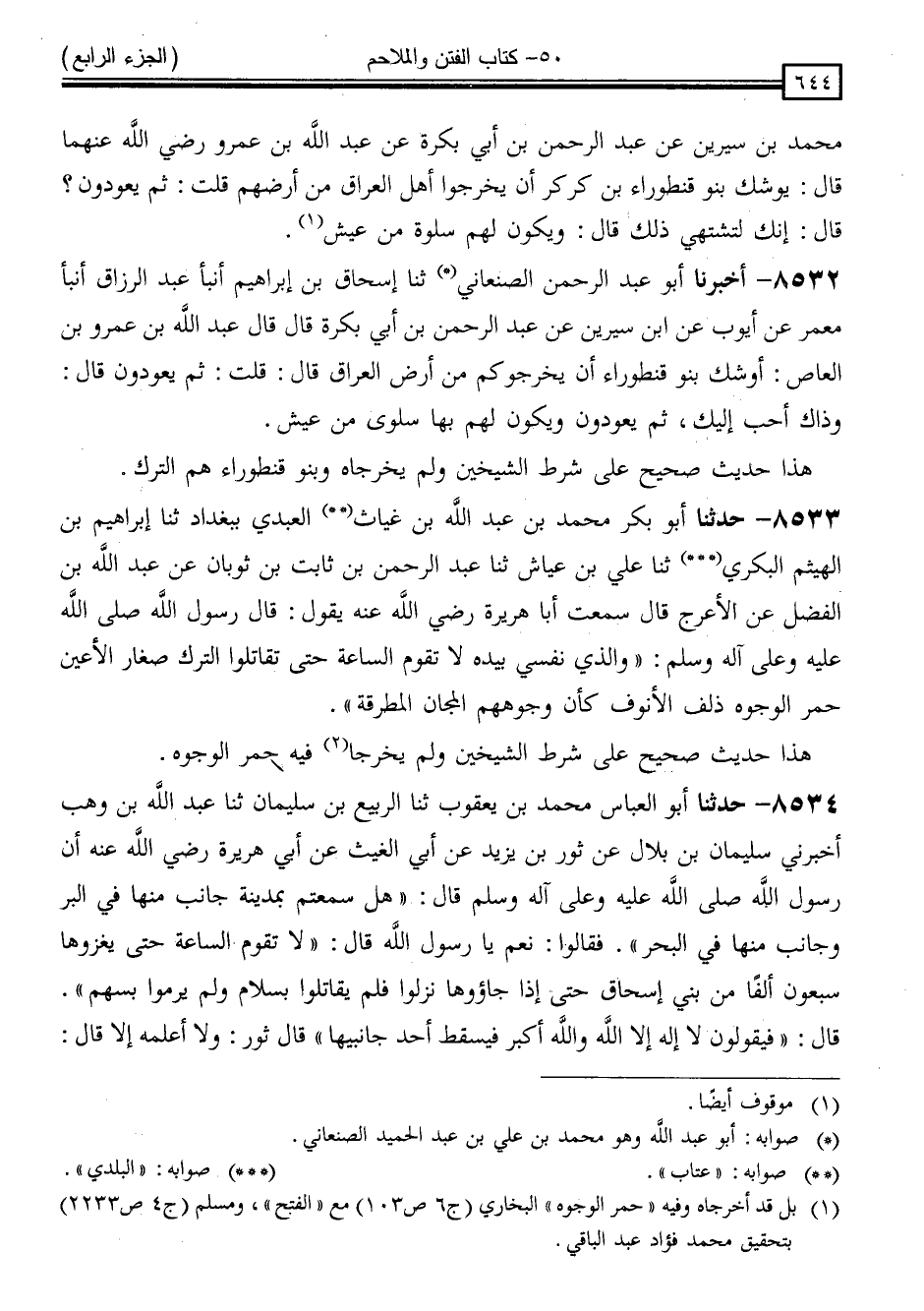 " هَذَا حَدِيثٌ صَحِيحٌ عَلَى شَرْطِ الشَّيْخَيْنِ ، وَلَمْ يُخْرِجَاهُ ، وَبَنُو قَنْطُورَاءَ هُمُ التُّرْكُ "