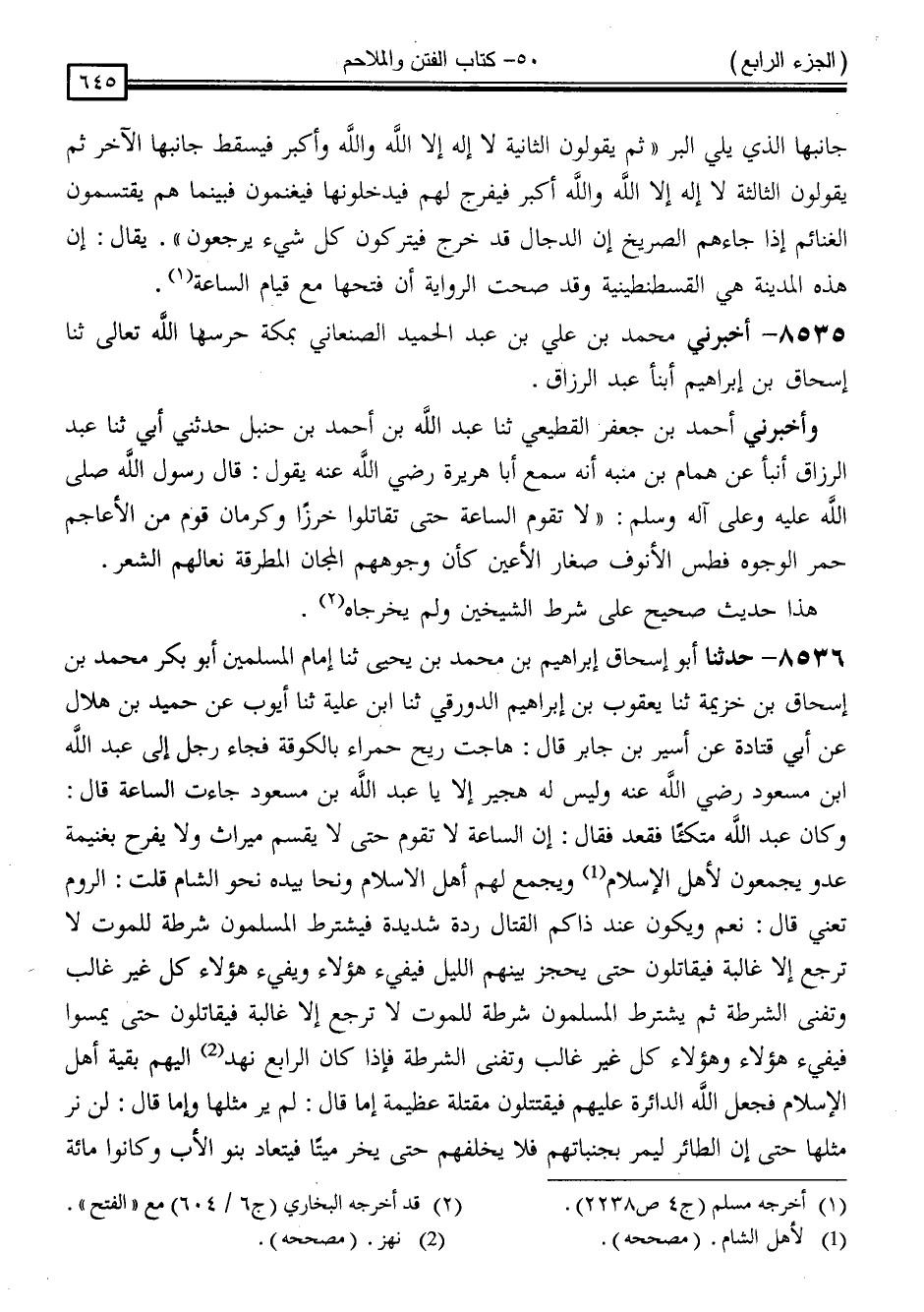 8536 - حَدَّثَنَا أَبُو إِسْحَاقَ إِبْرَاهِيمُ بْنُ مُحَمَّدِ بْنِ يَحْيَى ، ثَنَا إِمَامُ الْمُسْلِمِينَ أَبُو بَكْرٍ مُحَمَّدُ بْنُ إِسْحَاقَ بْنِ خُزَيْمَةَ ، ثَنَا يَعْقُوبُ بْنُ إِبْرَاهِيمَ الدَّوْرَقِيُّ ، ثَنَا ابْنُ عُلَيَّةَ ، ثَنَا أَيُّوبُ ، عَنْ حُمَيْدِ بْنِ هِلَالٍ ، عَنْ أَبِي قَتَادَةَ ، عَنْ أَسِيرِ بْنِ جَابِرٍ ، قَالَ: هَاجَتْ رِيحٌ حَمْرَاءُ بِالْكُوفَةِ ، فَجَاءَ رَجُلٌ إِلَى عَبْدِ اللَّهِ بْنِ مَسْعُودٍ رَضِيَ اللَّهُ عَنْهُ ، وَلَيْسَ لَهُ هِجِّيرٌ: أَلَا يَا عَبْدَ اللَّهِ بْنَ مَسْعُودٍ جَاءَتِ السَّاعَةُ ، قَالَ: وَكَانَ عَبْدُ اللَّهِ مُتَّكِئًا فَقَعَدَ ، فَقَالَ: " إِنَّ السَّاعَةَ لَا تَقُومُ حَتَّى لَا يُقَسَّمَ مِيرَاثٌ ، وَلَا يَفْرَحُ بِغَنِيمَةٍ عَدُوٍّ ، يَجْمَعُونَ لِأَهْلِ الْإِسْلَامِ وَيَجْمَعُ لَهُمْ أَهْلُ الْإِسْلَامِ " - وَنَحَا بِيَدِهِ نَحْوَ الشَّامِ - قُلْتُ: الرُّومَ تَعْنِي ؟ قَالَ: " نَعَمْ ، وَيَكُونُ عِنْدَ ذَاكُمُ الْقِتَالُ رِدَّةً شَدِيدَةً ، فَيَتَشَرَّطُ الْمُسْلِمُونَ شَرْطَةً لِلْمَوْتِ لَا تَرْجِعُ إِلَّا غَالِبَةٌ ، فَيُقَاتِلُونَ حَتَّى يَحْجِزَ بَيْنَهُمُ اللَّيْلُ فَيَفِيءُ هَؤُلَاءِ وَيَفِيءُ هَؤُلَاءِ ، كُلٌّ غَيْرُ غَالِبٍ وَتَفْنَى الشُّرْطَةُ ، ثُمَّ يَشْتَرِطُ الْمُسْلِمُونَ شَرْطَةً لِلْمَوْتِ لَا تَرْجِعُ إِلَّا غَالِبَةً ، فَيُقَاتِلُونَ حَتَّى يَحْجِزَ بَيْنَهُمُ اللَّيْلُ فَيَفِيءُ هَؤُلَاءِ وَهَؤُلَاءِ كُلٌّ غَيْرُ غَالِبٍ ، وَتَفْنَى الشُّرْطَةُ ثُمَّ يَشْتَرِطُ الْمُسْلِمُونَ شَرْطَةً لِلْمَوْتِ لَا تَرْجِعُ إِلَّا غَالِبَةً ، فَيُقَاتِلُونَ حَتَّى يُمْسُوا فَيَفِيءُ هَؤُلَاءِ وَهَؤُلَاءِ كُلٌّ غَيْرُ غَالِبٍ ، وَتَفْنَى الشُّرْطَةُ ، فَإِذَا كَانَ الرَّابِعُ نَهَدَ إِلَيْهِمْ بَقِيَّةُ أَهْلِ الْإِسْلَامِ فَجَعَلَ اللَّهُ الدَّائِرَةَ عَلَيْهِمْ ، فَيَقْتَتِلُونَ مَقْتَلَةً عَظِيمَةً - إِمَّا قَالَ: لَمْ يُرَ مِثْلُهَا ، وَإِمَّا قَالَ: لَنْ نَرَ مِثْلَهَا - حَتَّى إِنَّ الطَّائِرَ لَيَمُرُّ بِجَنَبَاتِهِمْ فَلَا يُخَلِّفُهُمْ حَتَّى يَخِرَّ مَيِّتًا ، فَيَتَعَادُّ بَنُو الْأَبِ وَكَانُوا مِائَةً ، -[646]- فَلَا يَجِدُونَ بَقِيَ مِنْهُمْ إِلَّا الرَّجُلُ الْوَاحِدُ ، فَبِأَيِّ غَنِيمَةٍ يَفْرَحُ أَوْ مِيرَاثٍ يُقَسَّمُ ، قَالَ: فَبَيْنَمَا هُمْ كَذَلِكَ إِذْ سَمِعُوا بِنَاسٍ هُمْ أَكْثَرُ مِنْ ذَاكَ جَاءَهُمُ الصَّرِيخُ أَنَّ الدَّجَّالَ قَدْ خَلَّفَ فِي ذَرَارِيِّهِمْ ، فَيَرْفُضُونَ مَا فِي أَيْدِيهِمْ وَيُقْبِلُونَ فَيَبْعَثُونَ عَشْرَةَ فَوَارِسَ طَلِيعَةً " ، قَالَ رَسُولُ اللَّهِ صَلَّى اللَّهُ عَلَيْهِ وَسَلَّمَ: " إِنِّي لَأَعْرِفُ أَسْمَاءَهُمْ وَأَسْمَاءَ آبَائِهِمْ ، وَأَلْوَانَ خُيُولِهِمْ ، هُمْ خَيْرُ فَوَارِسَ عَلَى ظَهْرِ الْأَرْضِ يَوْمَئِذٍ " وَقَالَ: " هُمْ خَيْرٌ مَنْ عَلَى ظَهْرِ الْأَرْضِ "