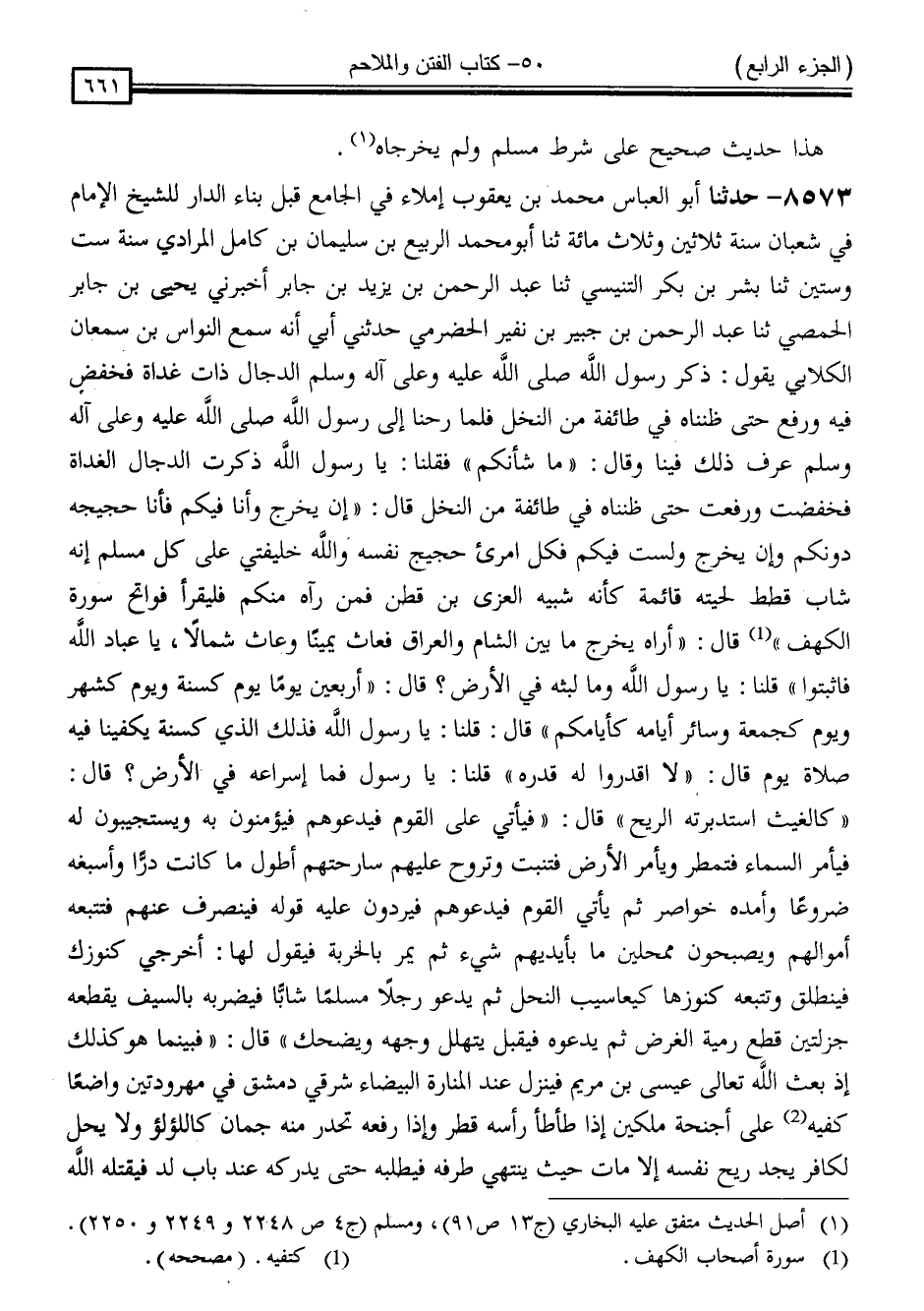 8573 - حَدَّثَنَا أَبُو الْعَبَّاسِ مُحَمَّدُ بْنُ يَعْقُوبَ - إِمْلَاءً فِي الْجَامِعِ قَبْلَ بِنَاءِ الدَّارِ لِلشَّيْخِ الْإِمَامِ فِي شَعْبَانَ سَنَةَ ثَلَاثِينَ وَثَلَاثَ مِائَةٍ - ، ثَنَا أَبُو مُحَمَّدٍ الرَّبِيعُ بْنُ سُلَيْمَانَ بْنِ كَامِلٍ الرَّمَادِيُّ - سَنَةَ سِتٍّ وَسِتِّينَ - ، ثَنَا بِشْرُ بْنُ بَكْرٍ التِّنِّيسِيُّ ، ثَنَا عَبْدُ الرَّحْمَنِ بْنُ يَزِيدَ بْنِ جَابِرٍ ، أَخْبَرَنِي يَحْيَى بْنُ جَابِرٍ الْحِمْصِيُّ ، ثَنَا عَبْدُ الرَّحْمَنِ بْنُ جُبَيْرِ بْنِ نُفَيْرٍ الْحَضْرَمِيُّ ، حَدَّثَنِي أَبِي ، أَنَّهُ سَمِعَ النَّوَّاسَ بْنَ سَمْعَانَ الْكِلَابِيَّ ، يَقُولُ: ذَكَرَ رَسُولُ اللَّهِ صَلَّى اللَّهُ عَلَيْهِ وَسَلَّمَ الدَّجَّالَ ذَاتَ غَدَاةٍ ، فَخَفَضَ فِيهِ وَرَفَعَ ، حَتَّى ظَنَنَّاهُ فِي طَائِفَةِ النَّخْلِ فَلَمَّا رُحْنَا إِلَى رَسُولِ اللَّهِ صَلَّى اللَّهُ عَلَيْهِ وَسَلَّمَ عَرَفَ ذَلِكَ فِينَا ، وَقَالَ: " مَا شَأْنُكُمْ ؟ " فَقُلْنَا: يَا رَسُولَ اللَّهِ ذَكَرْتَ الدَّجَّالَ الْغَدَاةَ فَخَفَضْتَ وَرَفَعْتَ ، حَتَّى ظَنَنَّاهُ فِي طَائِفَةٍ مِنَ النَّخْلِ ، قَالَ: " إِنْ يَخْرُجْ وَأَنَا فِيكُمْ فَأَنَا حَجِيجُهُ دُونَكُمْ ، وَإِنْ يَخْرُجْ وَلَسْتُ فِيكُمْ فَكُلُّ امْرِئٍ حَجِيجُ نَفْسِهِ ، وَاللَّهُ خَلِيفَتِي عَلَى كُلِّ مُسْلِمٍ إِنَّهُ شَابٌّ قَطَطٌ لِحْيَتُهُ ، قَائِمَةٌ كَأَنَّهُ شَبِيهُ الْعُزَّى بْنِ قَطَنٍ ، فَمَنْ رَآهُ مِنْكُمْ فَلْيَقْرَأْ فَوَاتِحَ سُورَةِ الْكَهْفِ " ثُمَّ قَالَ: " أُرَاهُ يَخْرُجُ مَا بَيْنَ الشَّامِ وَالْعِرَاقِ ، فَعَاثَ يَمِينًا وَعَاثَ شِمَالًا ، يَا عِبَادَ اللَّهِ اثْبُتُوا " قُلْنَا: يَا رَسُولَ اللَّهِ وَمَا لُبْثُهُ فِي الْأَرْضِ ؟ قَالَ: " أَرْبَعِينَ يَوْمًا يَوْمٌ كَسَنَةٍ ، وَيَوْمٌ كَشَهْرٍ ، وَيَوْمٌ كَجُمُعَةٍ ، وَسَائِرُ أَيَّامِهِ كَأَيَّامِكُمْ " قَالَ: قُلْنَا: يَا رَسُولَ اللَّهِ فَذَلِكَ الَّذِي كَسَنَةٍ يَكْفِينَا فِيهِ صَلَاةُ يَوْمٍ ؟ قَالَ: " لَا اقْدُرُوا لَهُ قَدْرَهُ " قُلْنَا: يَا رَسُولَ اللَّهِ فَمَا إِسْرَاعُهُ فِي الْأَرْضِ ؟ قَالَ: " كَالْغَيْثِ اسْتَدْبَرَتْهُ الرِّيحُ " قَالَ: " فَيَأْتِي عَلَى الْقَوْمِ فَيَدْعُوهُمْ فَيُؤْمِنُونَ بِهِ وَيَسْتَجِيبُونَ لَهُ فَيَأْمُرُ السَّمَاءَ فَتُمْطِرُ ، وَيَأْمُرُ الْأَرْضَ فَتُنْبِتُ ، وَتَرُوحُ عَلَيْهِمْ سَارِحَتُهُمْ أَطْوَلَ مَا كَانَتْ دَرًّا ، وَأَسْبَغَهُ ضُرُوعًا ، وَأَمَدَّهُ خَوَاصِرَ ، ثُمَّ يَأْتِي الْقَوْمَ فَيَدْعُوهُمْ فَيَرُدُّونَ عَلَيْهِ قَوْلَهُ فَيَنْصَرِفُ عَنْهُمْ ، فَتَتْبَعُهُ أَمْوَالُهُمْ وَيُصْبِحُونَ مُمْحِلِينَ مَا بِأَيْدِيهِمْ شَيْءٌ ، ثُمَّ يَمُرُّ بِالْخَرِبَةِ فَيَقُولُ لَهَا: أَخْرِجِي كُنُوزَكِ ، فَيَنْطَلِقُ وَتَتْبَعُهُ كُنُوزُهَا كَيَعَاسِيبِ النَّحْلِ ، ثُمَّ يَدْعُو رَجُلًا مُسْلِمًا شَابًّا فَيَضْرِبُهُ بِالسَّيْفِ فَيَقْطَعُهُ جِزْلَتَيْنِ ، قَطْعَ رَمْيَةِ الْغَرَضِ ، ثُمَّ يَدْعُوهُ فَيُقْبِلُ يَتَهَلَّلُ وَجْهُهُ وَيَضْحَكُ ، قَالَ: فَبَيْنَمَا هُوَ كَذَلِكَ إِذْ بَعَثَ اللَّهُ تَعَالَى عِيسَى ابْنَ مَرْيَمَ ، فَيَنْزِلُ عِنْدَ الْمَنَارَةِ الْبَيْضَاءِ شَرْقِيَّ دِمَشْقَ فِي مَهْرُودَتَيْنِ ، وَاضِعًا كَفَّيْهِ عَلَى أَجْنِحَةِ مَلَكَيْنِ ، إِذْا طَأْطَأَ رَأْسَهُ قَطَرَ ، وَإِذَا رَفَعَهُ تَحَدَّرَ مِنْهُ جُمَانٌ كَاللُّؤْلُؤِ ، وَلَا يَحِلُّ لِكَافِرٍ يَجِدُ رِيحَ نَفْسِهِ إِلَّا مَاتَ ، يَنْتَهِي حَيْثُ يَنْتَهِي طَرْفُهُ ، فَيَطْلُبُهُ حَتَّى يُدْرِكَهُ عِنْدَ بَابِ لُدٍّ فَيَقْتُلُهُ اللَّهُ ، -[662]- ثُمَّ يَأْتِي عِيسَى ابْنُ مَرْيَمَ عَلَيْهِ السَّلَامُ نَبِيُّ اللَّهِ قَوْ
