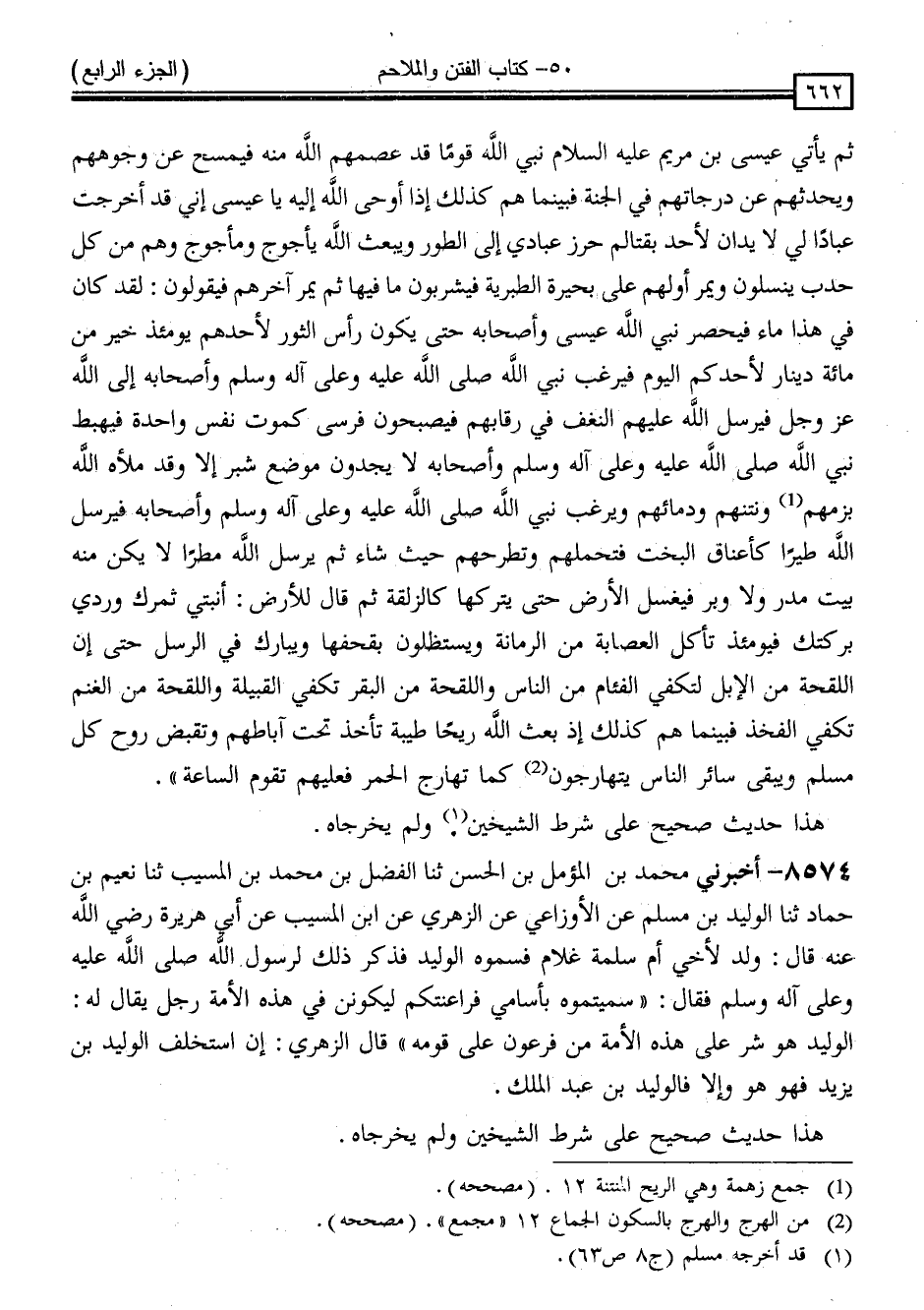 8574 - أَخْبَرَنِي مُحَمَّدُ بْنُ الْمُؤَمَّلِ بْنِ الْحَسَنِ ، ثَنَا الْفَضْلُ بْنُ مُحَمَّدِ بْنِ الْمُسَيِّبِ ، ثَنَا نُعَيْمُ بْنُ حَمَّادٍ ، ثَنَا الْوَلِيدُ بْنُ مُسْلِمٍ ، عَنِ الْأَوْزَاعِيِّ ، عَنِ الزُّهْرِيِّ ، عَنِ ابْنِ الْمُسَيِّبِ ، عَنْ أَبِي هُرَيْرَةَ رَضِيَ اللَّهُ عَنْهُ ، قَالَ: وُلِدَ لِأَخِي أُمِّ سَلَمَةَ غُلَامٌ فَسَمَّوْهُ الْوَلِيدُ ، فَذُكِرَ ذَلِكَ لِرَسُولِ اللَّهِ صَلَّى اللَّهُ عَلَيْهِ وَسَلَّمَ ، فَقَالَ: " سَمَّيْتُمُوهُ بَأَسَامِي فَرَاعِنَتِكُمْ ، لَيَكُونَنَّ فِي هَذِهِ الْأُمَّةِ رَجُلٌ يُقَالُ لَهُ الْوَلِيدُ ، هُوَ شَرٌّ عَلَى هَذِهِ الْأُمَّةِ مِنْ فِرْعَوْنَ عَلَى قَوْمِهِ " قَالَ الزُّهْرِيُّ: " إِنِ اسْتُخْلِفَ الْوَلِيدُ بْنُ يَزِيدَ فَهُوَ هُوَ ، وَإِلَّا فَالْوَلِيدُ بْنُ عَبْدِ الْمَلِكِ "