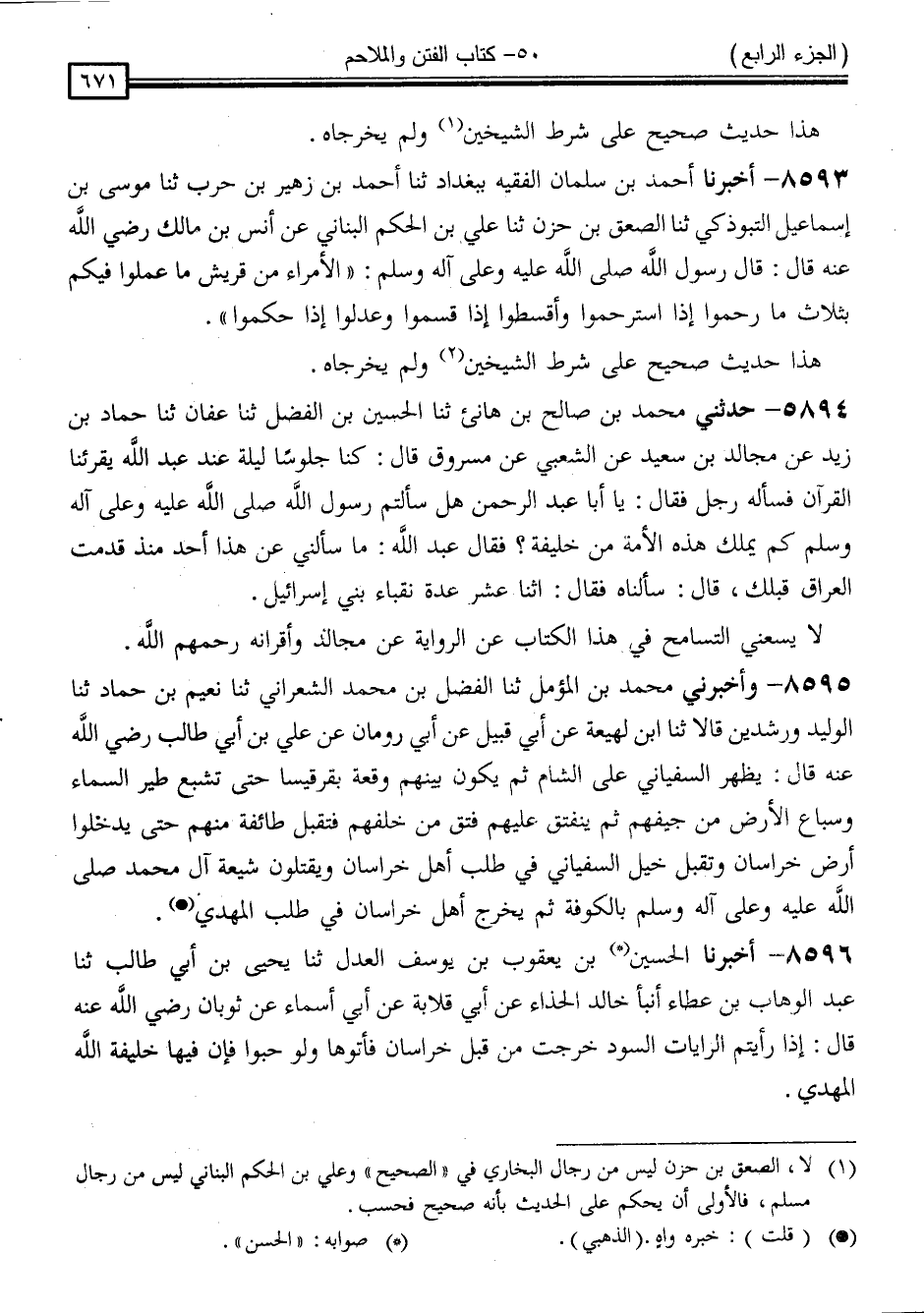 8595 - وَأَخْبَرَنِي مُحَمَّدُ بْنُ الْمُؤَمَّلِ ، ثَنَا الْفَضْلُ بْنُ مُحَمَّدٍ الشَّعْرَانِيُّ ، ثَنَا نُعَيْمُ بْنُ حَمَّادٍ ، ثَنَا الْوَلِيدُ ، وَرِشْدِينُ ، قَالَا: ثَنَا ابْنُ لَهِيعَةَ ، عَنْ أَبِي قَبِيلٍ ، عَنْ أَبِي رُومَانَ ، عَنْ عَلِيِّ بْنِ أَبِي طَالِبٍ رَضِيَ اللَّهُ عَنْهُ ، قَالَ: " يَظْهَرُ السُّفْيَانِيُّ عَلَى الشَّامِ ، ثُمَّ يَكُونُ بَيْنَهُمْ وَقْعَةٌ بِقَرْقِيسَا حَتَّى تَشْبَعُ طَيْرُ السَّمَاءِ وَسِبَاعُ الْأَرْضِ مِنْ جِيَفِهِمْ ، ثُمَّ يَنْفَتِقُ عَلَيْهِمْ فَتْقٌ مِنْ خَلْفِهِمْ ، فَتُقْبِلُ طَائِفَةٌ مِنْهُمْ حَتَّى يَدْخُلُوا أَرْضَ خُرَاسَانَ ، وَتُقْبِلُ خَيْلَ السُّفْيَانِيُّ فِي طَلَبِ أَهْلِ خُرَاسَانَ ، وَيَقْتُلُونَ شِيعَةَ آلِ مُحَمَّدٍ صَلَّى اللَّهُ عَلَيْهِ وَسَلَّمَ بِالْكُوفَةِ ، ثُمَّ يَخْرُجُ أَهْلُ خُرَاسَانَ فِي طَلَبِ الْمَهْدِيِّ "