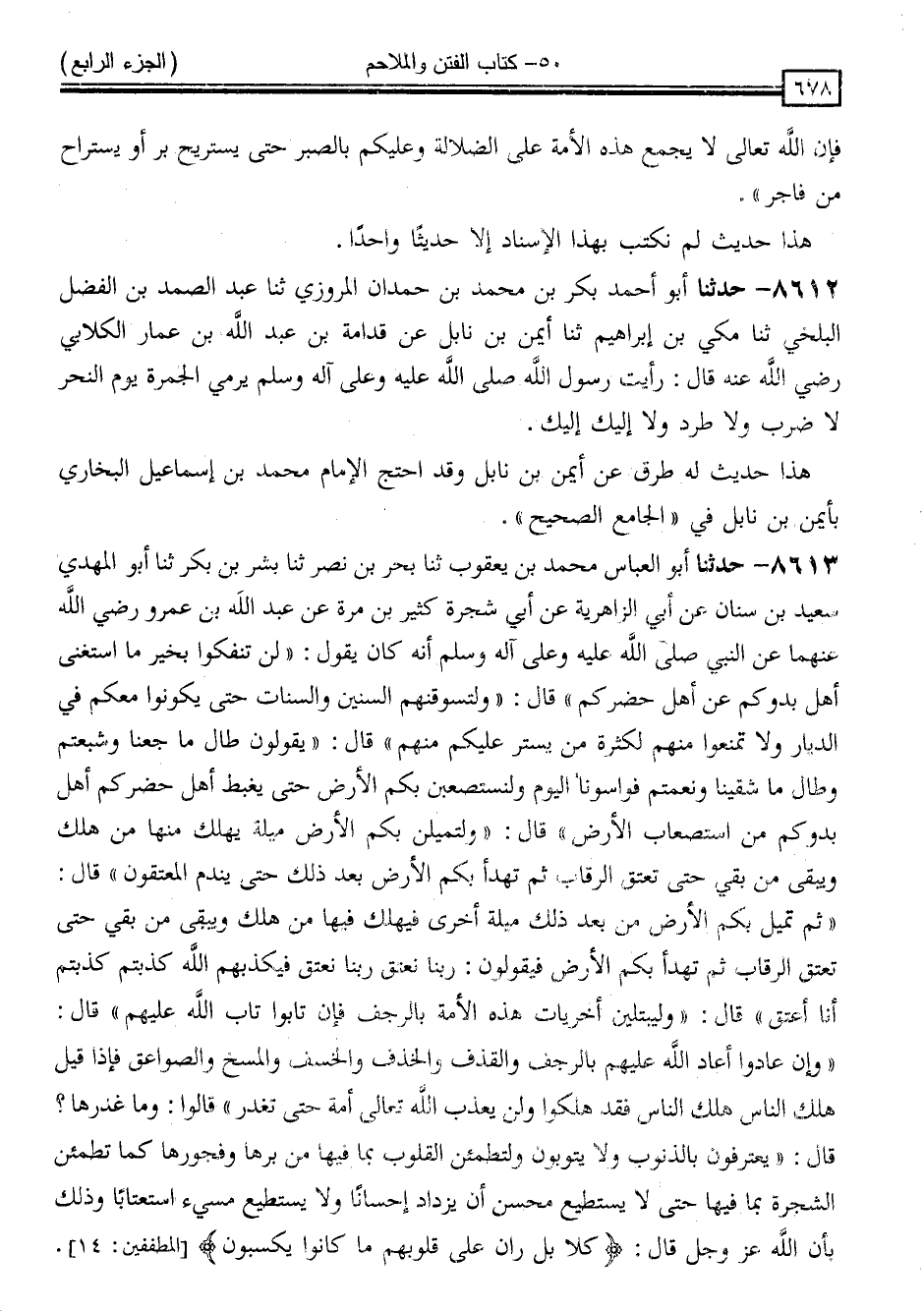 8613 - حَدَّثَنَا أَبُو الْعَبَّاسِ مُحَمَّدُ بْنُ يَعْقُوبَ ، ثَنَا بَحْرُ بْنُ نَصْرٍ ، ثَنَا بِشْرُ بْنُ بَكْرٍ ، ثَنَا أَبُو الْمَهْدِيِّ سَعِيدُ بْنُ سِنَانٍ ، عَنْ أَبِي الزَّاهِرِيَّةِ ، عَنْ أَبِي شَجَرَةَ كَثِيرِ بْنِ مُرَّةَ ، عَنْ عَبْدِ اللَّهِ بْنِ عَمْرٍو رَضِيَ اللَّهُ عَنْهُمَا ، عَنِ النَّبِيِّ صَلَّى اللَّهُ عَلَيْهِ وَسَلَّمَ أَنَّهُ كَانَ يَقُولُ: " لَنْ تَنْفَكُّوا بِخَيْرٍ مَا اسْتَغْنَى أَهْلُ بَدْوِكُمْ عَنْ أَهْلِ حَضَرِكُمْ " قَالَ: " وَلَتَسُوقَنَّهُمُ السِّنِينُ وَالسِّنَاتُ حَتَّى يَكُونُوا مَعَكُمْ فِي الدِّيَارِ ، وَلَا تَمْنَعُوا مِنْهُمْ لِكَثْرَةِ مَنْ يُسْتَرُ عَلَيْكُمْ مِنْهُمْ " قَالَ: " يَقُولُونَ طَالَمَا جُعْنَا وَشَبِعْتُمْ ، وَطَالَمَا شَقِينَا وَنَعِمْتُمْ فَوَاسُونَا الْيَوْمَ وَلَنَسْتَصْعِبَنَّ بِكُمُ الْأَرْضَ حَتَّى يَغْبِطَ أَهْلُ حَضَرِكُمْ أَهْلَ بَدْوِكُمْ مِنِ اسْتِصْعَابِ الْأَرْضِ " . قَالَ: " وَلَتَمِيلَنَّ بِكُمُ الْأَرْضُ مَيْلَةً يَهْلِكُ مِنْهَا مَنْ هَلَكَ وَيَبْقَى مَنْ بَقِيَ حَتَّى تُعْتَقَ الرِّقَابُ ، ثُمَّ تَهْدَأُ بِكُمُ الْأَرْضُ بَعْدَ ذَلِكَ حَتَّى يَنْدَمَ الْمُعْتِقُونَ " ، قَالَ: " ثُمَّ تَمِيلُ بِكُمُ الْأَرْضُ مِنْ بَعْدَ ذَلِكَ مَيْلَةً أُخْرَى فَيَهْلِكُ فِيهَا مَنْ هَلَكَ وَيَبْقَى مَنْ بَقِيَ حَتَّى تُعْتَقَ الرِّقَابُ ثُمَّ تَهْدَأُ بِكُمُ الْأَرْضُ فَيَقُولُونَ: رَبَّنَا نُعْتِقُ رَبَّنَا نُعْتِقُ فَيُكَذِّبُهُمُ اللَّهُ: كَذَبْتُمْ كَذَبْتُمْ أَنَا أُعْتِقُ " ، قَالَ: " وَلَيَبْتَلِيَنَّ أُخْرَيَاتُ هَذِهِ الْأُمَّةِ بِالرَّجْفِ فَإِنْ تَابُوا تَابَ اللَّهُ عَلَيْهِمْ " ، قَالَ: " وَإِنْ عَادُوا أَعَادَ اللَّهُ عَلَيْهِمْ بِالرَّجْفِ وَالْقَذْفِ وَالْخَذْفِ وَالْخَسْفِ وَالْمَسْخِ وَالصَّوَاعِقِ ، فَإِذَا قِيلَ: هَلَكَ النَّاسُ هَلَكَ النَّاسُ ، فَقَدْ هَلَكُوا ، وَلَنْ يُعَذِّبَ اللَّهُ تَعَالَى أُمَّةً حَتَّى تَغْدِرَ " ، قَالُوا: وَمَا غَدْرُهَا ؟ قَالَ: " يَعْتَرِفُونَ بِالذُّنُوبِ وَلَا يَتُوبُونَ ، وَلِتَطْمَئِنَّ بِالْقُلُوبِ بِمَا فِيهَا مِنْ بِرَّهَا وَفُجُورِهَا كَمَا تَطْمَئِنُّ الشَّجَرَةُ بِمَا فِيهَا ، حَتَّى لَا يَسْتَطِيعَ مُحْسِنٌ أَنْ يَزْدَادَ إِحْسَانًا ، وَلَا يَسْتَطِيعَ مُسِيءٌ اسْتِعْتَابًا " ، وَذَلِكَ بِأَنَّ اللَّهَ عَزَّ وَجَلَّ قَالَ: { كَلَّا بَلْ رَانَ عَلَى قُلُوبِهِمْ مَا كَانُوا يَكْسِبُونَ } [المطففين: 14]