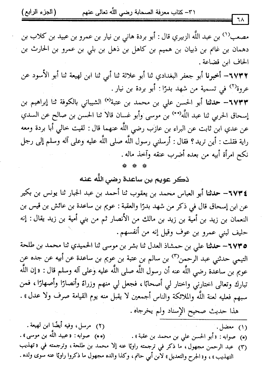 6735 - حَدَّثَنَا عَلِيُّ بْنُ حَمْشَاذٍ الْعَدْلُ ، ثَنَا بِشْرُ بْنُ مُوسَى ، ثَنَا الْحُمَيْدِيُّ ، ثَنَا مُحَمَّدُ بْنُ طَلْحَةَ التَّيْمِيُّ ، حَدَّثَنِي عَبْدُ الرَّحْمَنِ بْنُ سَالِمِ بْنِ عُتْبَةَ بْنِ عُوَيْمِ بْنِ سَاعِدَةَ ، عَنْ أَبِيهِ ، عَنْ جَدِّهِ ، عَنْ عُوَيْمِ بْنِ سَاعِدَةَ ، رَضِيَ اللَّهُ عَنْهُ أَنَّ رَسُولَ اللَّهِ صَلَّى اللَّهُ عَلَيْهِ وَسَلَّمَ ، قَالَ: " إِنَّ اللَّهَ تَبَارَكَ وَتَعَالَى اخْتَارَنِي وَاخْتَارَ بِي أَصْحَابًا فَجَعَلَ لِي مِنْهُمْ وُزَرَاءَ وَأَنْصَارًا وَأَصْهَارًا ، فَمَنْ سَبَّهُمْ فَعَلَيْهِ لَعْنَةُ اللَّهِ وَالْمَلَائِكَةِ وَالنَّاسِ أَجْمَعِينَ لَا يُقْبَلُ مِنْهُ يَوْمَ الْقِيَامَةِ صَرْفٌ وَلَا عَدْلٌ