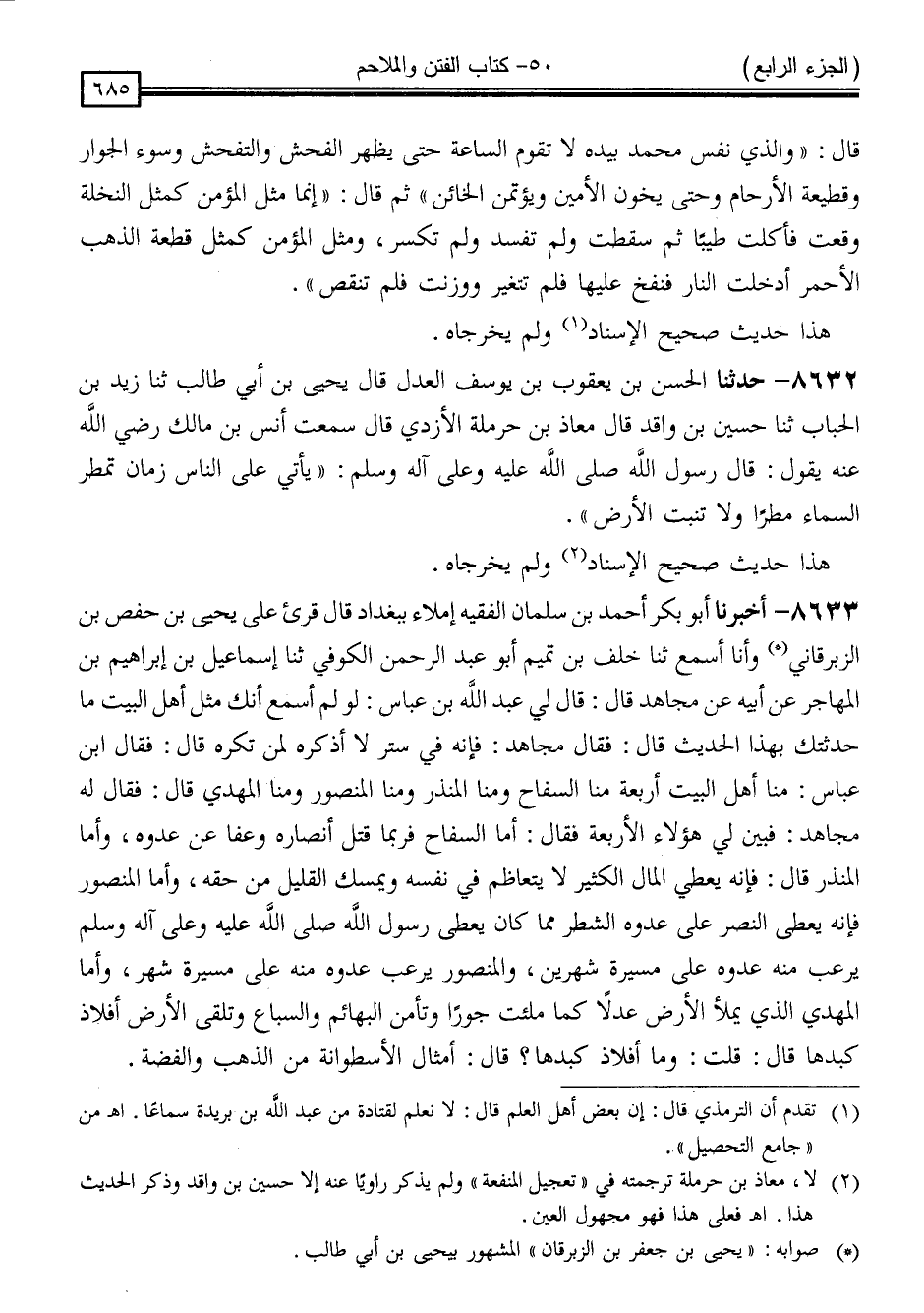 8633 - أَخْبَرَنَا أَبُو بَكْرٍ أَحْمَدُ بْنُ سَلْمَانَ الْفَقِيهُ إِمْلَاءً بِبَغْدَادَ ، قَالَ: قُرِئَ عَلَى يَحْيَى بْنِ حَفْصِ * بْنِ الزِّبْرِقَانِ ، وَأَنَا أَسْمَعُ ، ثَنَا خَلَفُ بْنُ تَمِيمٍ أَبُو عَبْدِ الرَّحْمَنِ الْكُوفِيُّ ، ثَنَا إِسْمَاعِيلُ بْنُ إِبْرَاهِيمَ بْنِ الْمُهَاجِرِ ، عَنْ أَبِيهِ ، عَنْ مُجَاهِدٍ ، قَالَ: قَالَ لِي عَبْدُ اللَّهِ بْنُ عَبَّاسٍ: لَوْ لَمْ أَسْمَعْ أَنَّكَ مِثْلُ أَهْلِ الْبَيْتِ مَا حَدَّثْتُكَ بِهَذَا الْحَدِيثِ ، قَالَ: " فَقَالَ مُجَاهِدٌ: فَإِنَّهُ فِي سِتْرٍ لَا أَذْكُرُهُ لِمَنْ تَكْرَهُ ، قَالَ: فَقَالَ ابْنُ عَبَّاسٍ: " مِنَّا أَهْلَ الْبَيْتِ أَرْبَعَةٌ: مِنَّا السَّفَّاحُ ، وَمِنَّا الْمُنْذِرُ ، وَمِنَّا الْمَنْصُورُ ، وَمِنَّا الْمَهْدِيُّ " ، قَالَ: فَقَالَ لَهُ مُجَاهِدٌ: فَبَيِّنْ لِي هَؤُلَاءِ الْأَرْبَعَةَ ، فَقَالَ: " أَمَّا السَّفَّاحُ فَرُبَّمَا قَتَلَ أَنْصَارَهُ وَعَفَا عَنْ عَدُوِّهِ ، وَأَمَّا الْمُنْذِرُ قَالَ: فَإِنَّهُ يُعْطِي الْمَالَ الْكَثِيرَ لَا يَتَعَاظَمُ فِي نَفْسِهِ وَيُمْسِكُ الْقَلِيلَ مِنْ حَقِّهِ ، وَأَمَّا الْمَنْصُورُ: فَإِنَّهُ يُعْطَى النَّصْرَ عَلَى عَدُوِّهِ الشَّطْرَ مِمَّا كَانَ يُعْطَى رَسُولُ اللَّهِ صَلَّى اللَّهُ عَلَيْهِ وَسَلَّمَ يُرْعَبُ مِنْهُ عَدُوُّهُ عَلَى مَسِيرَةِ شَهْرَيْنِ ، وَالْمَنْصُورُ يُرْعَبُ عَدُوُّهُ مِنْهُ عَلَى مَسِيرَةِ شَهْرٍ ، وَأَمَّا الْمَهْدِيُّ الَّذِي يَمْلَأُ الْأَرْضَ عَدْلًا كَمَا مُلِئَتْ جَوْرًا ، وَتَأْمَنَ الْبَهَائِمُ وَالسِّبَاعُ وَتُلْقِي الْأَرْضُ أَفْلَاذَ كَبِدِهَا " ، قَالَ: قُلْتُ: وَمَا أَفْلَاذُ كَبِدِهَا ؟ قَالَ: " أَمْثَالُ الْأُسْطُوَانَةُ مِنَ الذَّهَبِ وَالْفِضَّةِ " -[686]-
