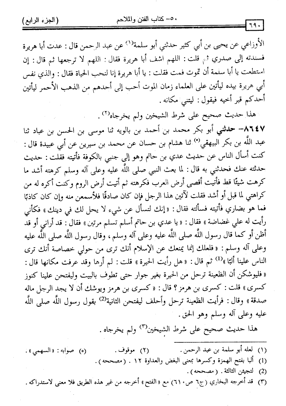 8647 - حَدَّثَنِي أَبُو بَكْرٍ مُحَمَّدُ بْنُ أَحْمَدَ بْنِ بَالَوَيْهِ ، ثَنَا مُوسَى بْنُ الْحَسَنِ بْنِ عَبَّادٍ ، ثَنَا عَبْدُ اللَّهِ بْنُ بَكْرٍ الْبَيْهَقِيُّ ، ثَنَا هِشَامُ بْنُ حَسَّانَ ، عَنْ مُحَمَّدِ بْنِ سِيرِينَ ، عَنْ أَبِي عُبَيْدَةَ ، قَالَ: كُنْتُ أَسْأَلُ النَّاسَ عَنْ حَدِيثِ عَدِيِّ بْنِ حَاتِمٍ وَهُوَ إِلَى جَنْبِي بِالْكُوفَةِ ، فَأَتَيْتُهُ فَقُلْتُ: حَدِيثٌ حَدَّثَتْهُ عَنْكَ فَحَدِّثْنِي بِهِ ، قَالَ: لَمَّا بُعِثَ النَّبِيُّ صَلَّى اللَّهُ عَلَيْهِ وَسَلَّمَ كَرِهْتُهُ أَشَدَّ مَا كَرِهْتُ شَيْئًا قَطُّ ، فَأَتَيْتُ أَقْصَى أَرْضِ الْعَرَبِ فَكَرِهْتُهُ ، ثُمَّ أَتَيْتُ أَرْضَ الرُّومِ وَكُنْتُ أَكْرَهُهُ مِنْ كَرَاهَتِي لِمَا قَبْلُ أَوْ أَشَدَّ ، فَقُلْتُ: لَآتِيَنَّ هَذَا الرَّجُلَ فَإِنْ كَانَ صَادِقًا فَلَأَسْمَعَنَّ مِنْهُ ، وَإِنْ كَانَ كَاذِبًا فَمَا هُوَ بِضَارِّيِّ ، فَأَتَيْتُهُ فَسَأَلْتُهُ ، فَقَالَ: " إِنَّكَ لَتَسْأَلُ عَنْ شَيْءٍ لَا يَحِلُّ لَكَ فِي دِينِكَ " فَكَأَنِّي رَأَيْتُ لَهُ عَلَى غَضَاضَةٍ ، فَقَالَ: " يَا عَدِيُّ بْنَ حَاتِمٍ أَسْلِمْ تَسْلَمْ " مَرَّتَيْنِ ، فَقَالَ: قَدْ أُرَانِي - أَوْ قَدْ أَظُنُّ أَوْ كَمَا قَالَ رَسُولُ اللَّهِ صَلَّى اللَّهُ عَلَيْهِ وَسَلَّمَ - وَقَالَ رَسُولُ اللَّهِ صَلَّى اللَّهُ عَلَيْهِ وَسَلَّمَ: " فَلَعَلَّكَ إِنَّمَا يَمْنَعُكَ عَنِ الْإِسْلَامِ أَنَّكَ تَرَى مِنْ حَوْلِي خَصَاصَةً ، إِنَّكَ تَرَى النَّاسَ عَلَيْنَا أَلَبًا " ثُمَّ قَالَ: " هَلْ رَأَيْتَ الْحِيرَةَ ؟ " قُلْتُ: لَمْ أَرَهَا وَقَدْ عَرَفْتُ مَكَانَهَا ، قَالَ: " فَلَيُوشِكَنَّ أَنَّ الظَّعِينَةَ تَرْحَلُ مِنَ الْحِيرَةِ بِغَيْرِ جِوَارٍ حَتَّى تَطُوفَ بِالْبَيْتِ ، وَلَيُفْتَحَنَّ عَلَيْنَا كُنُوزُ كِسْرَى " قُلْتُ: كِسْرَى بْنِ هُرْمُزَ ، قَالَ: " كِسْرَى بْنِ هُرْمُزَ ، وَيُوشِكُ أَنْ لَا يَجِدَ الرَّجُلُ مَالَهُ صَدَقَةً " وَقَالَ: " فَرَأَيْتُ الظَّعِينَةَ تَرْحَلُ وَأَحْلِفُ لَيُفْتَحَنَّ الثَّانِيَةَ بِقَوْلِ رَسُولِ اللَّهِ صَلَّى اللَّهُ عَلَيْهِ وَسَلَّمَ وَهُوَ الْحَقُّ "