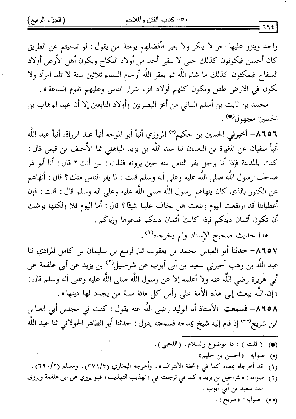 8658 - فَسَمِعْتُ الْأُسْتَاذَ أَبَا الْوَلِيدِ رَضِيَ اللَّهُ عَنْهُ ، يَقُولُ: كُنْتُ فِي مَجْلِسِ أَبِي الْعَبَّاسِ بْنِ شُرَيْحٍ * إِذْ قَامَ إِلَيْهِ شَيْخٌ يَمْدَحُهُ ، فَسَمِعْتُهُ يَقُولُ: حَدَّثَنَا أَبُو الطَّاهِرِ الْخَوْلَانِيُّ ، ثَنَا عَبْدُ اللَّهِ -[695]- بْنُ وَهْبٍ ، أَخْبَرَنِي سَعِيدُ بْنُ أَبِي أَيُّوبَ ، عَنْ شَرَاحِيلَ بْنِ يَزِيدَ ، عَنْ أَبِي عَلْقَمَةَ ، عَنْ أَبِي هُرَيْرَةَ رَضِيَ اللَّهُ عَنْهُ ، أَنَّ رَسُولَ اللَّهِ صَلَّى اللَّهُ عَلَيْهِ وَسَلَّمَ ، قَالَ: " إِنَّ اللَّهَ يَبْعَثُ عَلَى رَأْسِ كُلِّ مِائَةِ سَنَةٍ مَنْ يُجَدِّدُ لَهَا دِينَهَا "