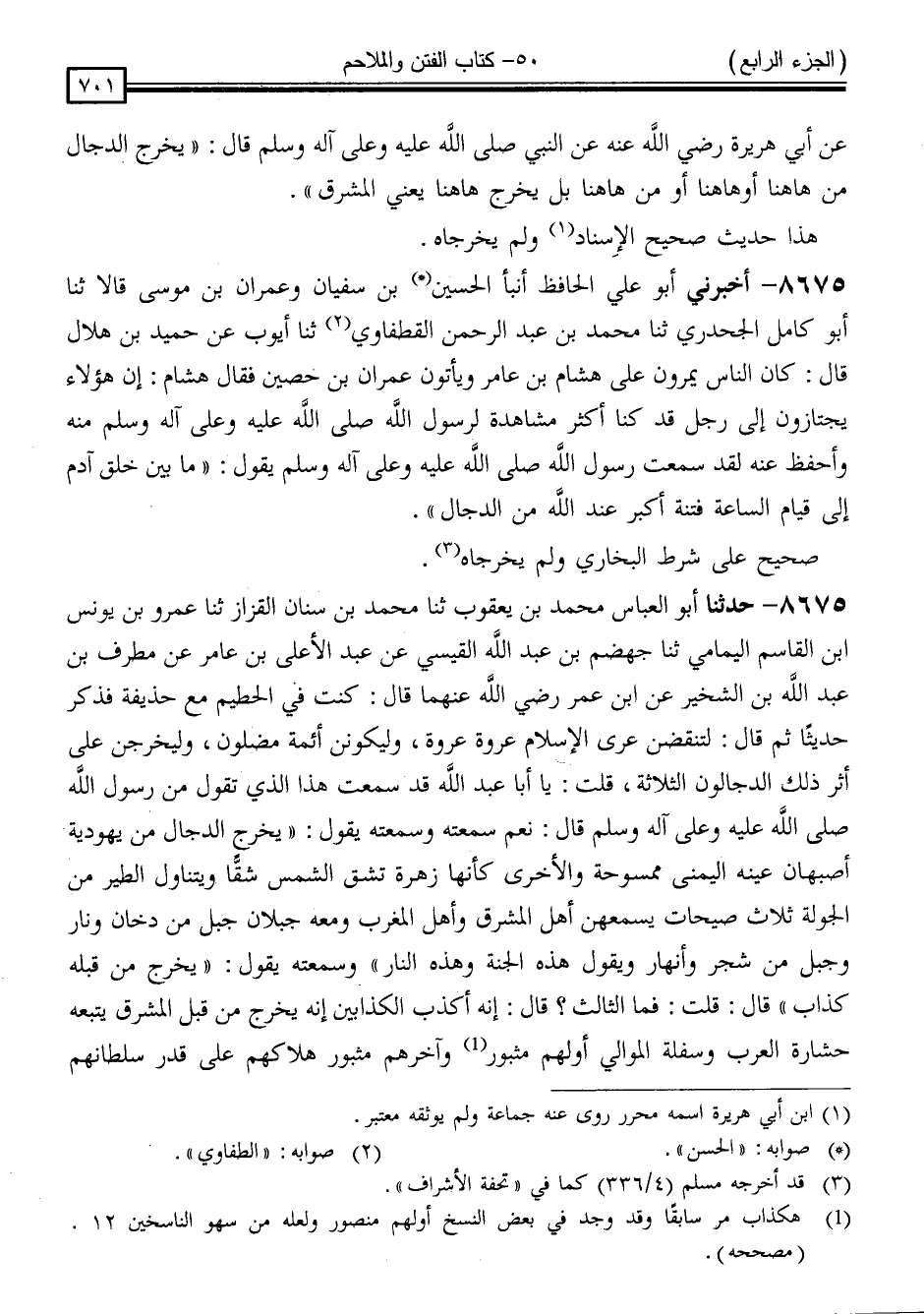 8675 - أَخْبَرَنِي أَبُو عَلِيٍّ الْحَافِظُ ، أَنْبَأَ الْحُسَيْنُ * بْنُ سُفْيَانَ ، وَعِمْرَانُ بْنُ مُوسَى ، قَالَا: ثَنَا أَبُو كَامِلٍ الْجَحْدَرِيُّ ، ثَنَا مُحَمَّدُ بْنُ عَبْدِ الرَّحْمَنِ الطُّفَاوِيُّ ، ثَنَا أَيُّوبُ ، عَنْ حُمَيْدِ بْنِ هِلَالٍ ، قَالَ: كَانَ النَّاسُ يَمُرُّونَ عَلَى هِشَامِ بْنِ عَامِرٍ وَيَأْتُونَ عِمْرَانَ بْنَ حُصَيْنٍ ، فَقَالَ هِشَامٌ: إِنَّ هَؤُلَاءِ يِجْتَازُونَ إِلَى رَجُلٍ قَدْ كُنَّا أَكْثَرَ مُشَاهَدَةً لِرَسُولِ اللَّهِ صَلَّى اللَّهُ عَلَيْهِ وَسَلَّمَ مِنْهُ وَأَحْفَظَ عَنْهُ ، لَقَدْ سَمِعْتُ رَسُولَ اللَّهِ صَلَّى اللَّهُ عَلَيْهِ وَسَلَّمَ يَقُولُ: " مَا بَيْنَ خَلْقِ آدَمَ إِلَى قِيَامِ السَّاعَةِ فِتْنَةٌ أَكْبَرُ عِنْدَ اللَّهِ مِنَ الدَّجَّالِ "