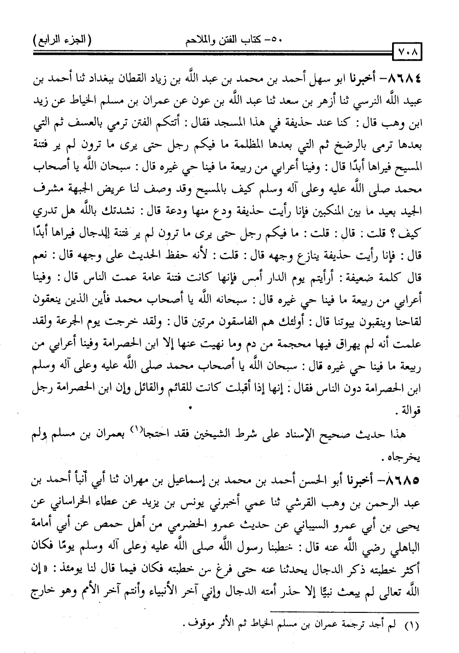 8684 - أَخْبَرَنَا أَبُو سَهْلٍ أَحْمَدُ بْنُ مُحَمَّدِ بْنِ عَبْدِ اللَّهِ بْنِ زِيَادٍ الْقَطَّانُ بِبَغْدَادَ ، ثَنَا أَحْمَدُ بْنُ عُبَيْدِ اللَّهِ النَّرْسِيُّ ، ثَنَا أَزْهَرُ بْنُ سَعْدٍ ، ثَنَا عَبْدُ اللَّهِ بْنُ عَوْنٍ ، عَنْ عِمْرَانَ بْنِ مُسْلِمٍ الْخَيَّاطِ ، عَنْ زَيْدِ بْنِ وَهْبٍ ، قَالَ: كُنَّا عِنْدَ حُذَيْفَةَ فِي هَذَا الْمَسْجِدِ ، فَقَالَ: " أَتَتْكُمُ الْفِتَنُ تَرْمِي بِالْعَسْفِ ، ثُمَّ الَّتِي بَعْدَهَا تَرْمِي بِالرَّضْخِ ، ثُمَّ الَّتِي بَعْدَهَا الْمُظْلِمَةُ مَا فِيكُمْ رَجُلٌ حَتَّى يَرَى مَا تَرَوْنَ ، لَمْ يَرَ فِتْنَةَ الْمَسِيحِ فَيَرَاهَا أَبَدًا " ، قَالَ: وَفِينَا أَعْرَابِيٌّ مِنْ رَبِيعَةَ مَا فِينَا حَيٌّ غَيْرُهُ ، قَالَ: سُبْحَانَ اللَّهِ يَا أَصْحَابَ مُحَمَّدٍ صَلَّى اللَّهُ عَلَيْهِ وَسَلَّمَ ، كَيْفَ بِالْمَسِيحِ وَقَدْ وُصَفَ لَنَا عَرِيضُ الْجَبْهَةِ مُشْرِفُ الْجِيدِ ، بَعِيدٌ مَا بَيْنَ الْمَنْكِبَيْنِ ، فَأَنَا رَأَيْتُ حُذَيْفَةَ وَدَعَ مِنْهَا وَدَعَةً ، قَالَ: نَشَدْتُكَ بِاللَّهِ هَلْ تَدْرِي كَيْفَ قُلْتُ ؟ قَالَ: قُلْتَ: " مَا فِيكُمْ رَجُلٌ حَتَّى يَرَى مَا تَرَوْنَ ، لَمْ يَرَ فِتْنَةَ الدَّجَّالِ فَيَرَاهَا أَبَدًا " ، قَالَ: فَأَنَا رَأَيْتُ حُذَيْفَةَ يُنَازِعُ وَجْهَهُ ، قَالَ: قُلْتُ: لِأَنَّهُ حَفِظَ الْحَدِيثَ عَلَى وَجْهِهِ ؟ قَالَ: نَعَمْ ، قَالَ: ثُمَّ قَالَ كَلِمَةً ضَعِيفَةً: " أَرَأَيْتُمْ يَوْمَ الدَّارِ أَمْسِ فَإِنَّهَا كَانَتْ فِتْنَةً عَامَّةً عَمَّتِ النَّاسَ " ، قَالَ: وَفِينَا أَعْرَابِيٌّ مِنْ رَبِيعَةَ مَا فِينَا حَيٌّ غَيْرُهُ ، قَالَ: سُبْحَانَ اللَّهِ يَا أَصْحَابَ مُحَمَّدٍ فَأَيْنَ الَّذِينَ يَنعَقُونَ لِقَاحَنَا ، وَيَنْقُبُونَ بُيُوتَنَا ؟ قَالَ: " أُولَئِكَ هُمُ الْفَاسِقُونَ " - مَرَّتَيْنِ - قَالَ: " وَلَقَدْ خَرَجْتُ يَوْمَ الْجَرَعَةِ وَلَقَدْ عَلِمْتُ أَنَّهُ لَمْ يُهَرَاقَ فِيهَا مِحْجَمَةٌ مِنْ دَمٍ ، وَمَا نَهَيْتُ عَنْهَا إِلَّا ابْنَ الْحِصْرَامَةِ " وَفِينَا أَعْرَابِيٌّ مِنْ رَبِيعَةَ مَا فِينَا حَيٌّ غَيْرُهُ ، قَالَ: سُبْحَانَ اللَّهِ يَا أَصْحَابَ مُحَمَّدٍ صَلَّى اللَّهُ عَلَيْهِ وَسَلَّمَ ابْنُ الْحِصْرَامَةِ دُونَ النَّاسِ ، فَقَالَ: " إِنَّهَا إِذَا أَقْبَلَتْ كَانَتْ لِلْقَائِمِ وَالْقَائِلِ ، وَإِنَّ ابْنَ الْحِصْرَامَةِ رَجُلٌ قَوَّالَةٌ "