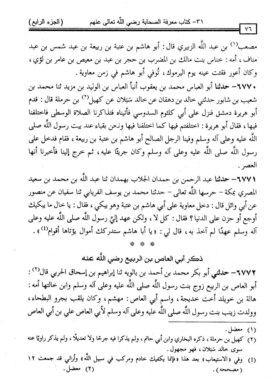 6772 - حَدَّثَنِي أَبُو بَكْرٍ مُحَمَّدُ بْنُ أَحْمَدَ بْنِ بَالَوَيْهِ ، ثَنَا إِبْرَاهِيمُ بْنُ إِسْحَاقَ الْحَرْبِيُّ ، قَالَ: " أَبُو الْعَاصِ بْنُ الرَّبِيعِ زَوْجُ بِنْتِ رَسُولِ اللَّهِ صَلَّى اللَّهُ عَلَيْهِ وَسَلَّمَ وَابْنُ خَالَتِهَا ، أُمُّهُ هَالَةُ بِنْتُ خُوَيْلِدٍ أُخْتُ خَدِيجَةَ وَاسْمُ أَبِي الْعَاصِ مُهَشَّمٌ ، وَكَانَ يُلَقَّبُ بِجِرْوِ الْبَطْحَاءِ ، وَوَلَدَتْ زَيْنَبُ بِنْتُ رَسُولِ اللَّهِ صَلَّى اللَّهُ عَلَيْهِ وَسَلَّمَ لِأَبِي الْعَاصِ عَلِيَّ بْنَ أَبِي الْعَاصِ -[77]- وَأُمَامَةَ بِنْتَ أَبِي الْعَاصِ ، وَتُوُفِّيَ أَبُو الْعَاصِ سَنَةَ إِحْدَى عَشْرَةَ فِي خِلَافَةِ أَبِي بَكْرٍ رَضِيَ اللَّهُ عَنْهُ "