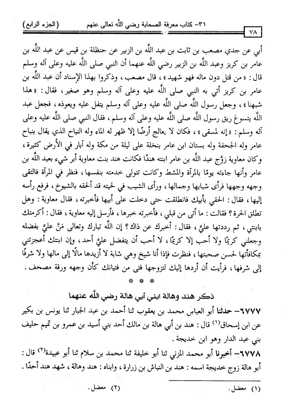 6778 - أَخْبَرَنَا أَبُو مُحَمَّدٍ الْمُزَنِيُّ ، ثَنَا أَبُو خَلِيفَةَ ، ثَنَا مُحَمَّدُ بْنُ سَلَّامٍ ، ثَنَا أَبُو عُبَيْدَةَ ، قَالَ: " أَبُو هَالَةَ زَوْجُ خَدِيجَةَ ، اسْمُهُ هِنْدُ بْنُ النَّبَّاشِ بْنِ زُرَارَةَ وَابْنَاهُ هِنْدٌ وَهَالَةُ شَهِدَ هِنْدٌ أَحَدًا "