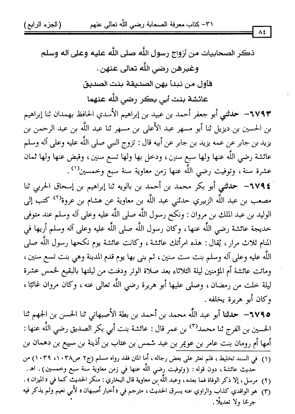 6795 - حَدَّثَنَا أَبُو عَبْدِ اللَّهِ مُحَمَّدُ بْنُ أَحْمَدَ بْنِ بُطَّةَ الْأَصْبَهَانِيُّ ، ثنا الْحَسَنُ بْنُ الْجَهْمِ ، ثنا الْحُسَيْنُ بْنُ الْفَرَجِ ، ثنا مُحَمَّدُ بْنُ عُمَرَ ، قَالَ: " عَائِشَةُ بِنْتُ أَبِي بَكْرٍ الصِّدِّيقِ رَضِيَ اللَّهُ عَنْهَا أُمُّهَا أُمُّ رُومَانَ بِنْتُ عَامِرِ بْنِ عُوَيْمِرِ بْنِ عَبْدِ شَمْسِ بْنِ عَتَّابِ بْنِ أُذَيْنَةَ بْنِ سُبَيْعِ بْنِ دُهْمَانَ بْنِ -[85]- الْحَارِثِ بْنِ غَنْمِ بْنِ مَالِكِ بْنِ كِنَانَةَ ، تَزَوَّجَهَا رَسُولُ اللَّهِ صَلَّى اللَّهُ عَلَيْهِ وَسَلَّمَ فِي شَوَّالٍ سَنَةَ عَشْرٍ مِنَ النُّبُوَّةِ قَبْلَ الْهِجْرَةِ بِثَلَاثِ سِنِينَ ، وَعَرَّسَ بِهَا رَسُولُ اللَّهِ صَلَّى اللَّهُ عَلَيْهِ وَسَلَّمَ فِي شَوَّالٍ عَلَى رَأْسِ ثَمَانِيَةِ أَشْهُرٍ مِنَ الْهِجْرَةِ ، وَكَانَتْ يَوْمَ ابْتَنَى بِهَا بِنْتَ تِسْعِ سِنِينَ "