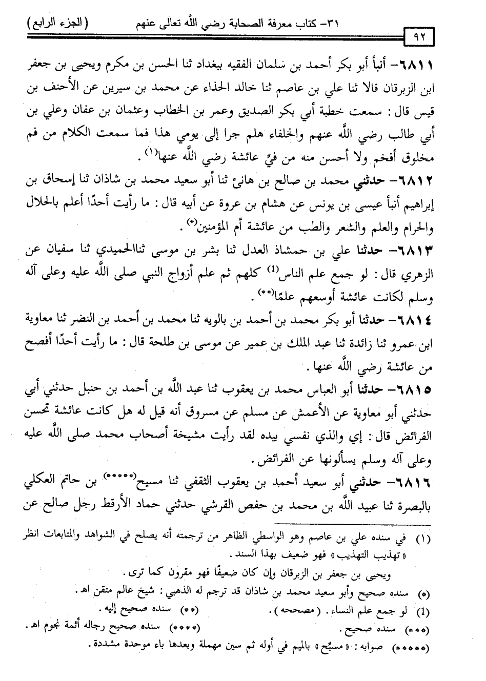 6815 - حَدَّثَنَا أَبُو الْعَبَّاسِ مُحَمَّدُ بْنُ يَعْقُوبَ ، ثنا عَبْدُ اللَّهِ بْنُ أَحْمَدَ بْنِ حَنْبَلٍ ، حَدَّثَنِي أَبِي ، حَدَّثَنِي أَبُو مُعَاوِيَةَ ، عَنِ الْأَعْمَشِ ، عَنْ مُسْلِمٍ ، عَنْ مَسْرُوقٍ ، أَنَّهُ قِيلَ لَهُ: هَلْ كَانَتْ عَائِشَةُ تُحْسِنُ الْفَرَائِضَ ؟ قَالَ: " إِي وَالَّذِي نَفْسِي بِيَدِهِ ، لَقَدْ رَأَيْتُ مَشْيَخَةَ أَصْحَابِ مُحَمَّدٍ صَلَّى اللَّهُ عَلَيْهِ وَسَلَّمَ يَسْأَلُونَهَا عَنِ الْفَرَائِضِ "