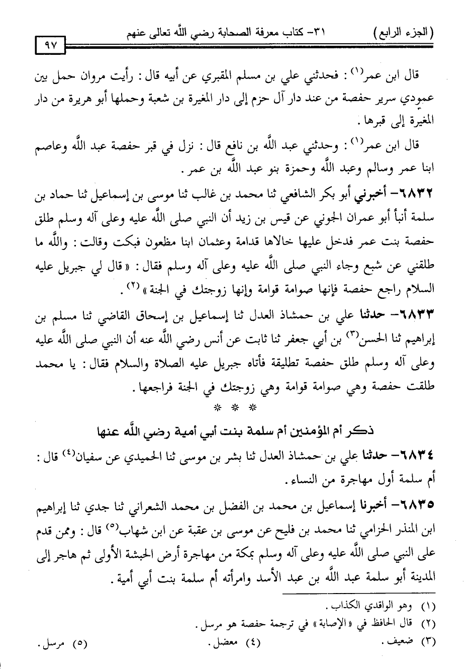 - قَالَ ابْنُ عُمَرَ: وَحَدَّثَنِي عَبْدُ اللَّهِ بْنُ نَافِعٍ ، قَالَ: " نَزَلَ فِي قَبْرِ حَفْصَةَ عَبْدُ اللَّهِ ، وَعَاصِمٌ ، ابْنَا عُمَرَ ، وَسَالِمٌ ، وَعَبْدُ اللَّهِ وَحَمْزَةُ بَنُو عَبْدِ اللَّهِ بْنِ عُمَرَ "