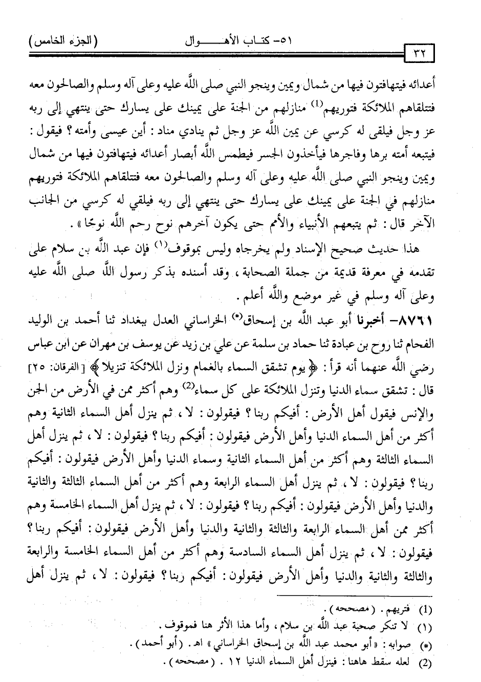 8761 - أَخْبَرَنَا (أَبُو) عَبْدِ اللَّهِ بْنُ إِسْحَاقَ الْخُرَاسَانِيُّ الْعَدْلُ ، بِبَغْدَادَ ، ثَنَا أَحْمَدُ بْنُ الْوَلِيدِ الْفَحَّامُ ، ثَنَا رَوْحُ بْنُ عُبَادَةَ ، ثَنَا حَمَّادُ بْنُ سَلَمَةَ ، عَنْ عَلِيِّ بْنِ زَيْدٍ ، عَنْ يُوسُفَ بْنِ مِهْرَانَ ، عَنِ ابْنِ عَبَّاسٍ رَضِيَ اللَّهُ عَنْهُمَا ، أَنَّهُ قَرَأَ: { يَوْمَ تَشَقَّقُ السَّمَاءُ بِالْغَمَامِ وَنُزِّلَ الْمَلَائِكَةُ تَنْزِيلًا } [الفرقان: 25] قَالَ: " تَشَقَّقُ سَمَاءُ الدُّنْيَا وَتَنْزِلُ الْمَلَائِكَةُ عَلَى كُلِّ سَمَاءٍ ، فَيَنْزِلُ أَهْلُ السَّمَاءِ الدُّنْيَا وَهُمْ أَكْثَرُ مِمَّنْ فِي الْأَرْضِ مِنَ الْجِنِّ وَالْإِنْسِ ، فَيَقُولُ أَهْلُ الْأَرْضِ: أَفِيكُمْ رَبُّنَا ؟ فَيَقُولُونَ: لَا ، ثُمَّ يَنْزِلُ أَهْلُ السَّمَاءِ الثَّانِيَةِ وَهُمْ أَكْثَرُ مِنْ أَهْلِ السَّمَاءِ الدُّنْيَا وَأَهْلِ الْأَرْضِ فَيَقُولُونَ: أَفِيكُمْ رَبُّنَا ؟ فَيَقُولُونَ: لَا ، ثُمَّ يَنْزِلُ أَهْلُ السَّمَاءِ الثَّالِثَةِ وَهُمْ أَكْثَرُ مِنْ أَهْلِ السَّمَاءِ الثَّانِيَةِ وَسَمَاءِ الدُّنْيَا وَأَهْلِ الْأَرْضِ فَيَقُولُونَ: أَفِيكُمْ رَبُّنَا ؟ فَيَقُولُونَ: لَا ، ثُمَّ يَنْزِلُ أَهْلُ السَّمَاءِ الرَّابِعَةِ وَهُمْ أَكْثَرُ مَنْ أَهْلِ السَّمَاءِ الثَّالِثَةِ وَالثَّانِيَةِ وَالدُّنْيَا وَأَهْلِ الْأَرْضِ فَيَقُولُونَ: أَفِيكُمْ رَبُّنَا ؟ فَيَقُولُونَ: لَا ، ثُمَّ يَنْزِلُ أَهْلُ السَّمَاءِ الْخَامِسَةِ وَهُمْ أَكْثَرُ مِنْ أَهْلِ السَّمَاءِ الرَّابِعَةِ وَالثَّالِثَةِ وَالثَّانِيَةِ وَالدُّنْيَا وَأَهْلِ الْأَرْضِ فَيَقُولُونَ: أَفِيكُمْ رَبُّنَا ؟ فَيَقُولُونَ: لَا ، ثُمَّ يَنْزِلُ أَهْلُ السَّمَاءِ السَّادِسَةِ وَهُمْ أَكْثَرُ مِنْ أَهْلِ السَّمَاءِ الْخَامِسَةِ وَالرَّابِعَةِ وَالثَّالِثَةِ وَالثَّانِيَةِ وَالدُّنْيَا وَأَهْلِ الْأَرْضِ فَيَقُولُونَ: أَفِيكُمْ رَبُّنَا ؟ فَيَقُولُونَ: لَا ، ثُمَّ يَنْزِلُ أَهْلُ -[33]- السَّمَاءِ السَّابِعَةِ وَهُمْ أَكْثَرُ مِنْ أَهْلِ السَّمَاءِ السَّادِسَةِ وَالْخَامِسَةِ وَالرَّابِعَةِ وَالثَّالِثَةِ وَالثَّانِيَةِ وَالدُّنْيَا وَأَهْلِ الْأَرْضِ فَيَقُولُونَ: أَفِيكُمْ رَبُّنَا ؟ فَيَقُولُونَ: لَا ثُمَّ يَنْزِلُ الْكُرُوبِيُّونَ وَهُمْ أَكْثَرُ مَنْ أَهْلِ السَّمَاوَاتِ السَّبْعِ وَالْأَرَضِينَ وَحَمَلَةِ الْعَرْشِ لَهُمْ قُرُونٌ كُعُوبٌ كَكُعُوبِ الْقَنَا ، مَا بَيْنَ قَدَمِ أَحَدِهِمْ كَذَا وَكَذَا ، وَمِنْ أَخْمَصِ قَدَمِهِ إِلَى كَعْبِهِ مَسِيرَةُ خَمْسِمِائَةِ عَامٍ ، وَمِنْ كَعْبِهِ إِلَى رُكْبَتِهِ مَسِيرَةُ خَمْسِمِائَةِ ، وَمِنْ رُكْبَتِهِ إِلَى أَرْنَبَتِهِ مَسِيرَةُ خَمْسِمِائَةِ عَامٍ ، وَمِنْ تَرْقُوَتِهِ إِلَى مَوْضِعِ الْقُرْطِ مَسِيرَةُ خَمْسِمِائَةِ عَامٍ "
