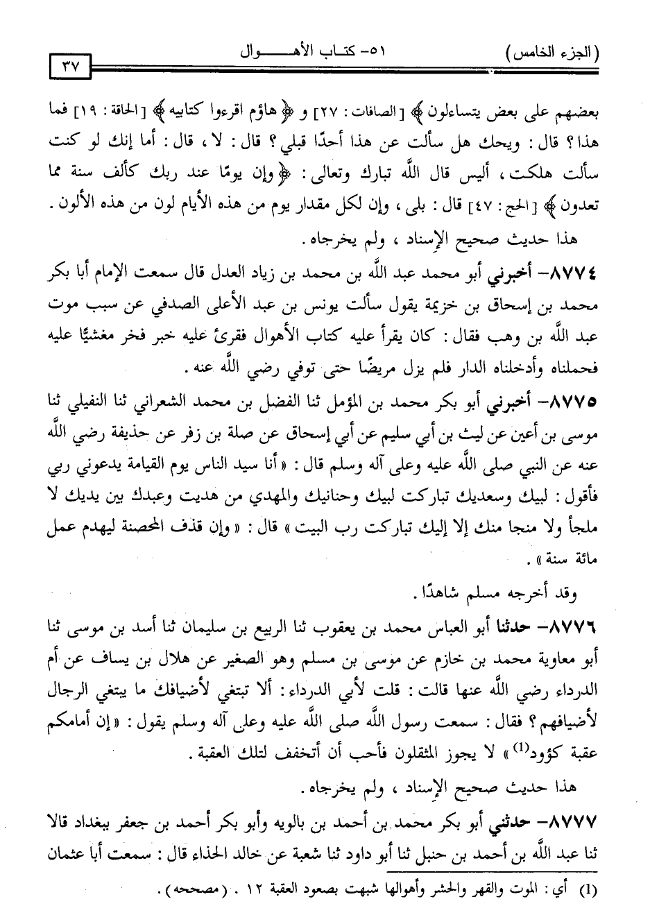 8775 - أَخْبَرَنِي أَبُو بَكْرٍ مُحَمَّدُ بْنُ الْمُؤَمَّلِ ، ثَنَا الْفَضْلُ بْنُ مُحَمَّدٍ الشَّعْرَانِيُّ ، ثَنَا النُّفَيْلِيُّ ، ثَنَا مُوسَى بْنُ أَعْيَنَ ، عَنْ لَيْثِ بْنِ أَبِي سُلَيْمٍ ، عَنْ أَبِي إِسْحَاقَ ، عَنْ صِلَةَ بْنِ زُفَرَ ، عَنْ حُذَيْفَةَ رَضِيَ اللَّهُ عَنْهُ ، عَنِ النَّبِيِّ صَلَّى اللَّهُ عَلَيْهِ وَسَلَّمَ ، قَالَ: " أَنَا سَيِّدُ النَّاسِ يَوْمَ الْقِيَامَةِ ، يَدْعُونِي رَبِّي فَأَقُولُ: لَبَّيْكَ وَسَعْدَيْكَ تَبَارَكْتَ لَبَّيْكَ وَحَنَانَيْكَ ، وَالْمَهْدِيُّ مَنْ هَدَيْتَ وَعَبْدُكَ بَيْنَ يَدَيْكَ ، لَا مَلْجَأَ وَلَا مَنْجَا مِنْكَ إِلَّا إِلَيْكَ ، تَبَارَكْتَ رَبَّ الْبَيْتِ " قَالَ: " وَإِنَّ قَذْفَ الْمُحْصَنَةِ لَيَهْدِمُ عَمَلَ مِائَةِ سَنَةٍ "
