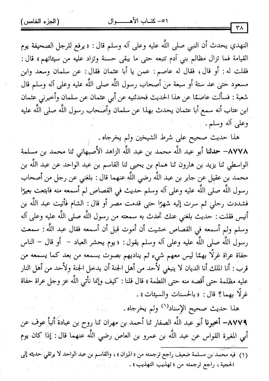 8778 - حَدَّثَنَا أَبُو عَبْدِ اللَّهِ مُحَمَّدُ بْنُ عَبْدِ اللَّهِ الزَّاهِدُ الْأَصْبَهَانِيُّ ، ثَنَا مُحَمَّدُ بْنُ مَسْلَمَةَ الْوَاسِطِيُّ ، ثَنَا يَزِيدُ بْنُ هَارُونَ ، ثَنَا هَمَّامُ بْنُ يَحْيَى ، ثَنَا الْقَاسِمُ بْنُ عَبْدِ الْوَاحِدِ ، عَنْ عَبْدِ اللَّهِ بْنِ مُحَمَّدِ بْنِ عَقِيلٍ ، عَنْ جَابِرِ بْنِ عَبْدِ اللَّهِ رَضِيَ اللَّهُ عَنْهُمَا ، قَالَ: بَلَغَنِي عَنْ رَجُلٍ مَنْ أَصْحَابِ رَسُولِ اللَّهِ صَلَّى اللَّهُ عَلَيْهِ وَسَلَّمَ حَدِيثٌ فِي الْقِصَاصِ لَمْ أَسْمَعْهُ مِنْهُ فَابْتَعْتُ بَعِيرًا فَشَدَدْتُ رَحْلِي ، ثُمَّ سِرْتُ إِلَيْهِ شَهْرًا حَتَّى قَدِمْتُ مِصْرَ - أَوْ قَالَ: الشَّامَ - فَأَتَيْتُ عَبْدَ اللَّهِ بْنَ أُنَيْسٍ فَقُلْتُ: حَدِيثٌ بَلَغَنِي عَنْكَ تُحَدِّثُ بِهِ سَمِعْتَهُ مَنْ رَسُولِ اللَّهِ صَلَّى اللَّهُ عَلَيْهِ وَسَلَّمَ وَلَمْ أَسْمَعْهُ فِي الْقِصَاصِ خَشِيتُ أَنْ أَمُوتَ قَبْلَ أَنْ أَسْمَعَهُ ، فَقَالَ عَبْدُ اللَّهِ: سَمِعْتُ رَسُولَ اللَّهِ صَلَّى اللَّهُ عَلَيْهِ وَسَلَّمَ ، يَقُولُ: " يَوْمَ يُحْشَرُ الْعِبَادُ - أَوْ قَالَ: النَّاسُ - حُفَاةً عُرَاةً غُرْلًا بُهْمًا لَيْسَ مَعَهُمْ شَيْءٌ ، ثُمَّ يُنَادِيهِمْ بِصَوْتٍ يَسْمَعُهُ مَنْ بَعُدَ كَمَا يَسْمَعُهُ مَنْ قَرُبَ: أَنَا الْمَلِكُ ، أَنَا الدَّيَّانُ ، لَا يَنْبَغِي لِأَحَدٍ مِنْ أَهْلِ الْجَنَّةِ أَنْ يَدْخُلَ الْجَنَّةَ ، وَلِأَحَدٍ مِنْ أَهْلِ النَّارِ عَلَيْهِ مَظْلِمَةٌ حَتَّى أَقُصَّهُ مِنْهُ ، وَلَا يَنْبَغِي لِأَحَدٍ مَنْ أَهْلِ النَّارِ أَنْ يَدْخُلَ النَّارَ وَلِأَحَدٍ مَنْ أَهْلِ الْجَنَّةِ عِنْدَهُ مَظْلِمَةٌ حَتَّى أَقُصَّهُ مِنْهُ حَتَّى اللَّطْمَةَ " قَالَ: قُلْنَا: كَيْفَ وَإِنَّمَا نَأْتِي اللَّهَ عَزَّ وَجَلَّ عُرَاةً حُفَاةً غُرْلًا بُهْمًا ، قَالَ: " بِالْحَسَنَاتِ وَالسَّيِّئَاتِ "