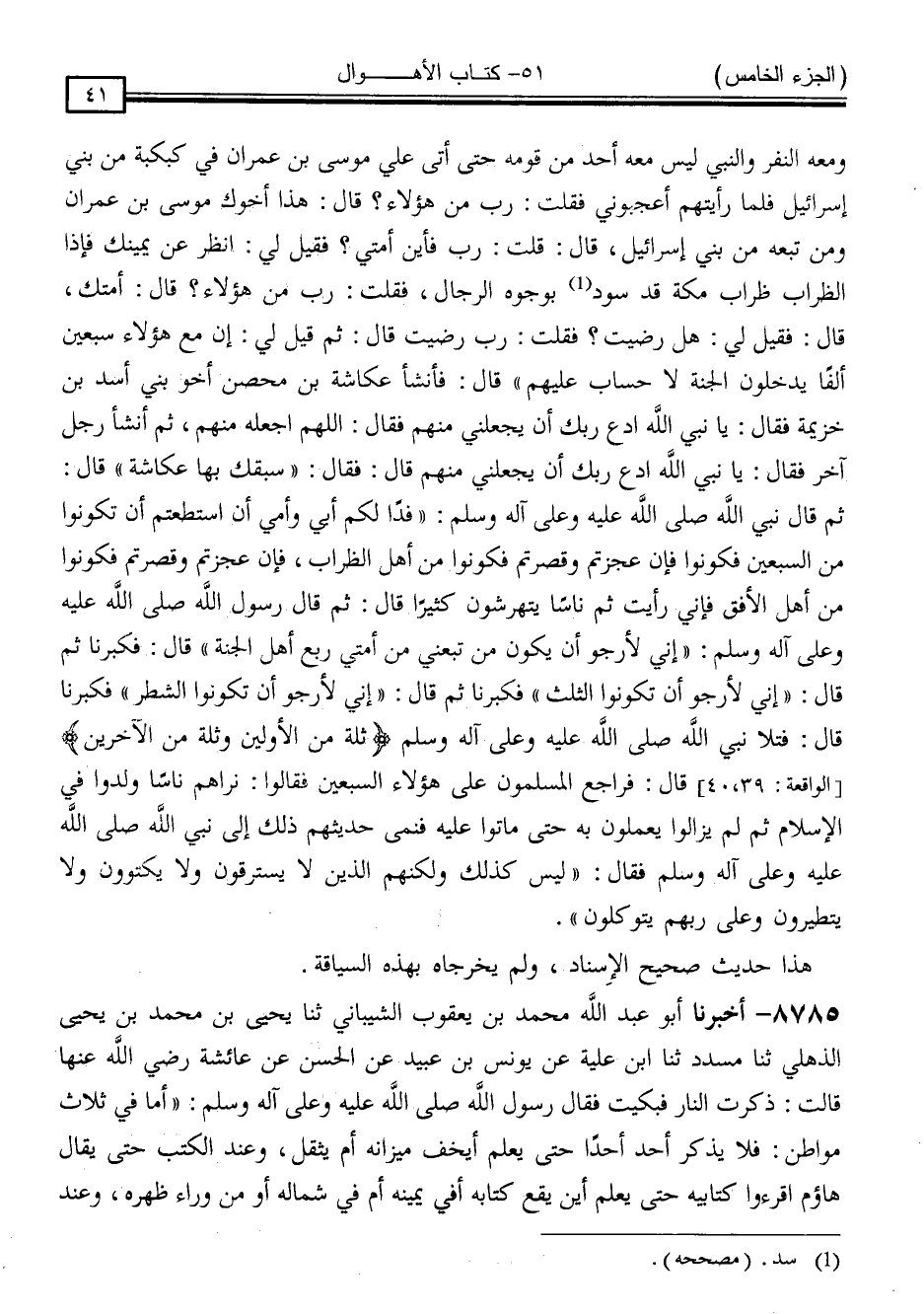 8785 - أَخْبَرَنَا أَبُو عَبْدِ اللَّهِ مُحَمَّدُ بْنُ يَعْقُوبَ الشَّيْبَانِيُّ ، ثَنَا يَحْيَى بْنُ مُحَمَّدِ بْنِ يَحْيَى الذُّهْلِيُّ ، ثَنَا مُسَدَّدٌ ، ثَنَا ابْنُ عُلَيَّةَ ، عَنْ يُونُسَ بْنِ عُبَيْدٍ ، عَنِ الْحَسَنِ ، عَنْ عَائِشَةَ رَضِيَ اللَّهُ عَنْهَا ، قَالَتْ: ذَكَرْتُ النَّارَ فَبَكَيْتُ ، فَقَالَ رَسُولُ اللَّهِ صَلَّى اللَّهُ عَلَيْهِ وَسَلَّمَ: " مَا لَكِ يَا عَائِشَةُ ؟ " قَالَتْ: ذَكَرْتُ النَّارَ فَبَكَيْتُ فَهَلْ تَذْكُرُونَ أَهْلِيكُمْ يَوْمَ الْقِيَامَةِ ؟ فَقَالَ رَسُولُ اللَّهِ صَلَّى اللَّهُ عَلَيْهِ وَسَلَّمَ: " أَمَّا فِي ثَلَاثِ مَوَاطِنَ فَلَا يَذْكُرُ أَحَدٌ أَحَدًا حَتَّى يَعْلَمَ أَيَخِفُّ مِيزَانُهُ أَمْ يَثْقُلُ ، وَعِنْدَ الْكُتُبِ حَتَّى يُقَالَ: { هَاؤُمُ اقْرَءُوا كِتَابِيَهْ } حَتَّى يَعْلَمَ أَيْنَ يَقَعُ كِتَابُهُ أَفِي يَمِينِهِ أَمْ فِي شِمَالِهِ أَوْ مِنْ وَرَاءِ ظَهْرِهِ ، وَعِنْدَ -[42]- الصِّرَاطِ إِذَا وَضَعَ بَيْنَ ظَهْرَيْ جَهَنَّمَ حَافَّتَاهُ كَلَالِيبُ كَثِيرَةٌ وَحَسَكٌ كَثِيرٌ يَحْبِسُ اللَّهُ بِهَا مَنْ شَاءَ مِنْ خَلْقِهِ حَتَّى يَعْلَمَ أَيَنْجُو أَمْ لَا "