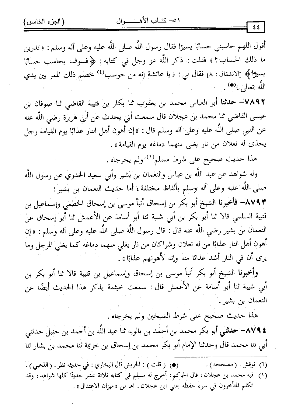 8793 - فَأَخْبَرْنَاهُ الشَّيْخُ أَبُو بَكْرِ بْنُ إِسْحَاقَ ، أَنْبَأَ مُوسَى بْنُ إِسْحَاقَ الْخَطْمِيُّ ، وَإِسْمَاعِيلُ بْنُ قُتَيْبَةَ السُّلَمِيُّ ، قَالَا: ثَنَا أَبُو بَكْرِ بْنُ أَبِي شَيْبَةَ ، ثَنَا أَبُو أُسَامَةَ ، عَنِ الْأَعْمَشِ ، ثَنَا أَبُو إِسْحَاقَ ، عَنِ النُّعْمَانِ بْنِ بَشِيرٍ رَضِيَ اللَّهُ عَنْهُمَا ، قَالَ: قَالَ رَسُولُ اللَّهِ صَلَّى اللَّهُ عَلَيْهِ وَسَلَّمَ: " إِنَّ أَهْوَنَ أَهْلِ النَّارِ عَذَابًا مَنْ لَهُ نَعْلَانِ وَشِرَاكَانِ مِنْ نَارٍ يَغْلِي مِنْهُمَا دِمَاغُهُ كَمَا يَغْلِي الْمِرْجَلُ ، وَمَا يَرَى أَنَّ فِي النَّارِ أَشَدَّ عَذَابًا مِنْهُ وَأَنَّهُ لَأَهْوَنُهُمْ عَذَابًا "