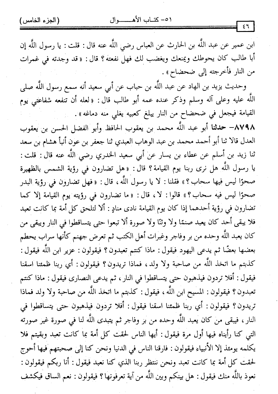 8798 - حَدَّثَنَا أَبُو عَبْدِ اللَّهِ مُحَمَّدُ بْنُ يَعْقُوبَ الْحَافِظُ ، وَأَبُو الْفَضْلِ الْحَسَنُ بْنُ يَعْقُوبَ الْعَدْلُ: قَالَا: ثَنَا أَبُو أَحْمَدَ مُحَمَّدُ بْنُ عَبْدِ الْوَهَّابِ الْعَبْدِيُّ ، ثَنَا جَعْفَرُ بْنُ عَوْنٍ ، أَنْبَأَ هِشَامُ بْنُ سَعْدٍ ، ثَنَا زَيْدُ بْنُ أَسْلَمَ ، عَنْ عَطَاءِ بْنِ يَسَارٍ ، عَنْ أَبِي سَعِيدٍ الْخُدْرِيِّ رَضِيَ اللَّهُ عَنْهُ ، قَالَ: قُلْتُ: يَا رَسُولَ اللَّهِ هَلْ نَرَى رَبَّنَا يَوْمَ الْقِيَامَةِ ؟ قَالَ: " هَلْ تُضَارُّونَ فِي رُؤْيَةِ الشَّمْسِ بِالظَّهِيرَةِ صَحْوًا لَيْسَ فِيهَا سَحَابٌ ؟ " فَقُلْنَا: لَا يَا رَسُولَ اللَّهِ ، قَالَ: " فَهَلْ تُضَارُّونَ فِي رُؤْيَةِ الْبَدْرِ صَحْوًا لَيْسَ فِيهِ سَحَابٌ ؟ " قَالُوا: لَا ، قَالَ: " مَا تُضَارُّونَ فِي رُؤْيَتِهِ يَوْمَ الْقِيَامَةِ إِلَّا كَمَا تُضَارُّونَ فِي رُؤْيَةِ أَحَدِهِمَا ، إِذَا كَانَ يَوْمُ الْقِيَامَةِ نَادَى مُنَادٍ أَلَا لِتَلْحَقْ كُلُّ أُمَّةٍ بِمَا كَانَتْ تَعْبُدُ فَلَا يَبْقَى أَحَدٌ كَانَ يَعْبُدُ صَنَمًا وَلَا وَثَنًا وَلَا صُورَةً إِلَّا ذَهَبُوا حَتَّى يَتَسَاقَطُوا فِي النَّارِ وَيَبْقَى مَنْ كَانَ يَعْبُدُ اللَّهَ وَحْدَهُ مِنْ بَرٍّ وَفَاجِرٍ وَغُبَّرَاتِ أَهْلَ الْكِتَابِ ، ثُمَّ تُعْرَضُ جَهَنَّمُ كَأَنَّهَا سَرَابٌ يَحْطِمُ بَعْضُهَا بَعْضًا ، ثُمَّ يُدْعَى الْيَهُودُ فَيَقُولُ: مَاذَا كُنْتُمْ تَعْبُدُونَ ؟ فَيَقُولُونَ: عُزَيْرًا ابْنَ اللَّهِ ، فَيَقُولُ: كَذَبْتُمْ مَا اتَّخَذَ اللَّهُ مِنْ صَاحِبَةٍ وَلَا وَلَدٍ فَمَا تُرِيدُونَ ؟ فَيَقُولُونَ: أَيْ رَبَّنَا ظَمِئْنَا اسْقِنَا ، فَيَقُولُ: أَفَلَا تَرِدُونَ ، فَيَذْهَبُونَ حَتَّى يَتَسَاقَطُوا فِي النَّارِ ، ثُمَّ يُدْعَى النَّصَارَى فَيَقُولُ: مَاذَا كُنْتُمْ تَعْبُدُونَ فَيَقُولُونَ: الْمَسِيحَ ابْنَ اللَّهِ ، فَيَقُولُ: كَذَبْتُمْ مَا اتَّخَذَ اللَّهُ مِنْ صَاحِبَةٍ وَلَا وَلَدٍ فَمَا تُرِيدُونَ ؟ فَيَقُولُونَ: أَيْ رَبَّنَا ظَمِئْنَا اسْقِنَا ، فَيَقُولُ: أَفَلَا تَرِدُونَ فَيَذْهَبُونَ حَتَّى يَتَسَاقَطُوا فِي النَّارِ فَيَبْقَى مَنْ كَانَ يَعْبُدُ اللَّهَ وَحْدَهُ مِنْ بَرٍّ وَفَاجِرٍ ثُمَّ يَتَبَدَّى اللَّهُ لَنَا فِي صُورَةٍ غَيْرِ صُورَتِهِ الَّتِي كُنَّا رَأَيْنَاهُ فِيهِ أَوَّلَ مَرَّةٍ فَيَقُولُ: أَيُّهَا النَّاسُ لَحِقَتْ كُلُّ أُمَّةٍ بِمَا كَانَتْ تَعْبُدُ وَبَقِيتُمْ ، فَلَا يُكَلِّمُهُ يَوْمَئِذٍ إِلَّا الْأَنْبِيَاءُ ، فَيَقُولُونَ: فَارَقْنَا النَّاسَ فِي الدُّنْيَا وَنَحْنُ كُنَّا إِلَى صُحْبَتِهِمْ فِيهَا أَحْوَجَ ، لَحِقَتْ كُلُّ أُمَّةٍ بِمَا كَانَتْ تَعْبُدُ وَنَحْنُ نَنْتَظِرُ رَبَّنَا الَّذِي كُنَّا نَعْبُدُ ، فَيَقُولُ: أَنَا رَبُّكُمْ ، فَيَقُولُونَ: نَعُوذُ بِاللَّهِ مِنْكَ ، فَيَقُولُ: هَلْ بَيْنَكُمْ وَبَيْنَ اللَّهِ مِنْ آيَةٍ تَعْرِفُونَهَا ؟ فَيَقُولُونَ: نَعَمُ السَّاقُ ، فَيُكْشَفُ -[47]- عَنْ سَاقٍ فَيَخِرُّ سَاجِدًا أَجْمَعُونَ وَلَا يَبْقَى أَحَدٌ كَانَ سَجَدَ فِي الدُّنْيَا سُمْعَةً وَلَا رِيَاءً وَلَا نِفَاقًا إِلَّا عَلَى ظَهْرِهِ طَبَقٌ وَاحِدٌ كُلَّمَا أَرَادَ أَنْ يَسْجُدَ خَرَّ عَلَى قَفَاهُ ، قَالَ: ثُمَّ يُرْفَعُ بَرُّنَا وَمُسِيئُنَا وَقَدْ عَادَ لَنَا فِي صُورَتِهِ الَّتِي رَأَيْنَاهُ فِيهَا أَوَّلَ مَرَّةٍ ، فَيَقُولُ: أَنَا رَبُّكُمْ ، فَيَقُولُونَ: نَعَمْ أَنْتَ رَبُّنَا ثَلَاثَ مَرَّاتٍ ثُمَّ يُضْرَبُ الْجِسْرُ عَلَى جَهَنَّمَ ، قُلْنَا: وَمَا الْجِسْرُ يَا رَسُولَ اللَّهِ بِأَبِينَا أَنْتَ وَأَمِّنَّا ؟ قَالَ: دَحْضٌ مَزِلَّةٌ لَهَا كَلَالِيبُ وَخَطَاطِيفُ وَحَسَكٌ بِنَجْدٍ عُقَيقٌ يُقَالُ لَهَا السَّعْدَانُ فَيَمُرُّ الْمُؤْم