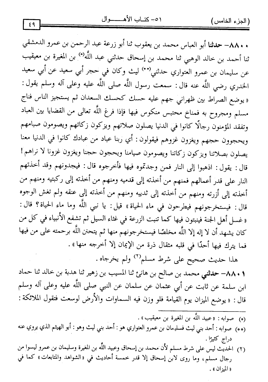 8800 - حَدَّثَنَا أَبُو الْعَبَّاسِ مُحَمَّدُ بْنُ يَعْقُوبَ ، ثَنَا أَبُو زُرْعَةَ عَبْدُ الرَّحْمَنِ بْنُ عَمْرٍو الدِّمَشْقِيُّ ، ثَنَا أَحْمَدُ بْنُ خَالِدٍ الْوَهْبِيُّ ، ثَنَا مُحَمَّدُ بْنُ إِسْحَاقَ ، حَدَّثَنِي عَبْدُ اللَّهِ بْنُ الْمُغِيرَةِ بْنِ مُعَيْقِيبٍ ، عَنْ سُلَيْمَانَ بْنِ عَمْرٍو الْعُتْوَارِيِّ ، حَدَّثَنِي لَيْثٌ ، وَكَانَ فِي حِجْرِ أَبِي سَعِيدٍ ، عَنْ أَبِي سَعِيدٍ الْخُدْرِيِّ رَضِيَ اللَّهُ عَنْهُ ، قَالَ: سَمِعْتُ رَسُولَ اللَّهِ صَلَّى اللَّهُ عَلَيْهِ وَسَلَّمَ ، يَقُولُ: " يُوضَعُ الصِّرَاطُ بَيْنَ ظَهْرَانَيْ جَهَنَّمَ عَلَيْهِ حَسَكٌ كَحَسَكِ السَّعْدَانِ ثُمَّ يَسْتَجِيزُ النَّاسُ فَنَاجٍ مُسَلَّمٌ وَمَجْرُوحٌ بِهِ فَمُنَاخٌ مُحْتَبَسٌ مَنْكُوسٌ فِيهَا ، فَإِذَا فَرَغَ اللَّهُ تَعَالَى مِنَ الْقَضَايَا بَيْنَ الْعِبَادِ وَتَفَقَّدَ الْمُؤْمِنُونَ رِجَالًا كَانُوا فِي الدُّنْيَا يُصَلُّونَ صَلَاتَهُمْ ، وَيُزَكُّونَ زَكَاتَهُمْ ، وَيَصُومُونَ صِيَامَهُمْ ، وَيَحُجُّونَ حَجَّهُمْ ، وَيَغْزُونَ غَزْوَهُمْ ، فَيَقُولُونَ: أَيْ رَبَّنَا عِبَادٌ مِنْ عِبَادِكَ كَانُوا فِي الدُّنْيَا مَعَنَا يُصَلُّونَ بِصَلَاتِنَا ، وَيُزَكُّونَ زَكَاتَنَا ، وَيَصُومُونَ صِيَامَنَا ، وَيَحُجُّونَ حَجَّنَا ، وَيَغْزُونَ غَزَوْنَا لَا نَرَاهُمْ ، قَالَ: يَقُولُ: اذْهَبُوا إِلَى النَّارِ فَمَنْ وَجَدْتُمُوهُ فِيهَا فَأَخْرِجُوهُ ، قَالَ: فَيَجِدُونَهُمْ وَقَدْ أَخَذَتْهُمُ النَّارُ عَلَى قَدْرِ أَعْمَالِهِمْ فَمِنْهُمْ مَنْ أَخَذَتْهُ إِلَى قَدَمَيْهِ ، وَمِنْهُمْ مَنْ أَخَذَتْهُ إِلَى رُكْبَتَيْهِ ، وَمِنْهُمْ مِنْ أُزْرَتِهُ ، وَمِنْهُمْ مَنْ أَخَذَتْهُ إِلَى ثَدْيَيْهِ ، وَمِنْهُمْ مَنْ أَخَذَتْهُ إِلَى عُنُقِهِ ، وَلَمْ تُغْشَ الْوُجُوهُ ، قَالَ: فَيَسْتَخْرِجُونَهُمْ فَيُطْرَحُونَ فِي مَاءِ الْحَيَاةِ " قِيلَ: يَا نَبِيَّ اللَّهِ وَمَا مَاءُ الْحَيَاةِ ؟ قَالَ: " غَسْلُ أَهْلِ الْجَنَّةِ فَيَنْبُتُونَ فِيهَا كَمَا تَنْبُتُ الزَّرْعَةُ فِي غُثَاءِ السَّيْلِ ثُمَّ تُشَفَّعُ الْأَنْبِيَاءُ فِي كُلِّ مَنْ كَانَ يَشْهَدُ أَنْ لَا إِلَهَ إِلَّا اللَّهُ مُخْلِصًا ، فَيَسْتَخْرِجُونَهُمْ مِنْهَا ، ثُمَّ يَتَحَنَّنُ اللَّهُ بِرَحْمَتِهِ عَلَى مَنْ فِيهَا فَمَا يَتْرُكُ فِيهَا أَحَدًا فِي قَلْبِهِ مِثْقَالُ ذَرَّةٍ مِنَ الْإِيمَانِ إِلَّا أَخْرَجَهُ مِنْهَا "