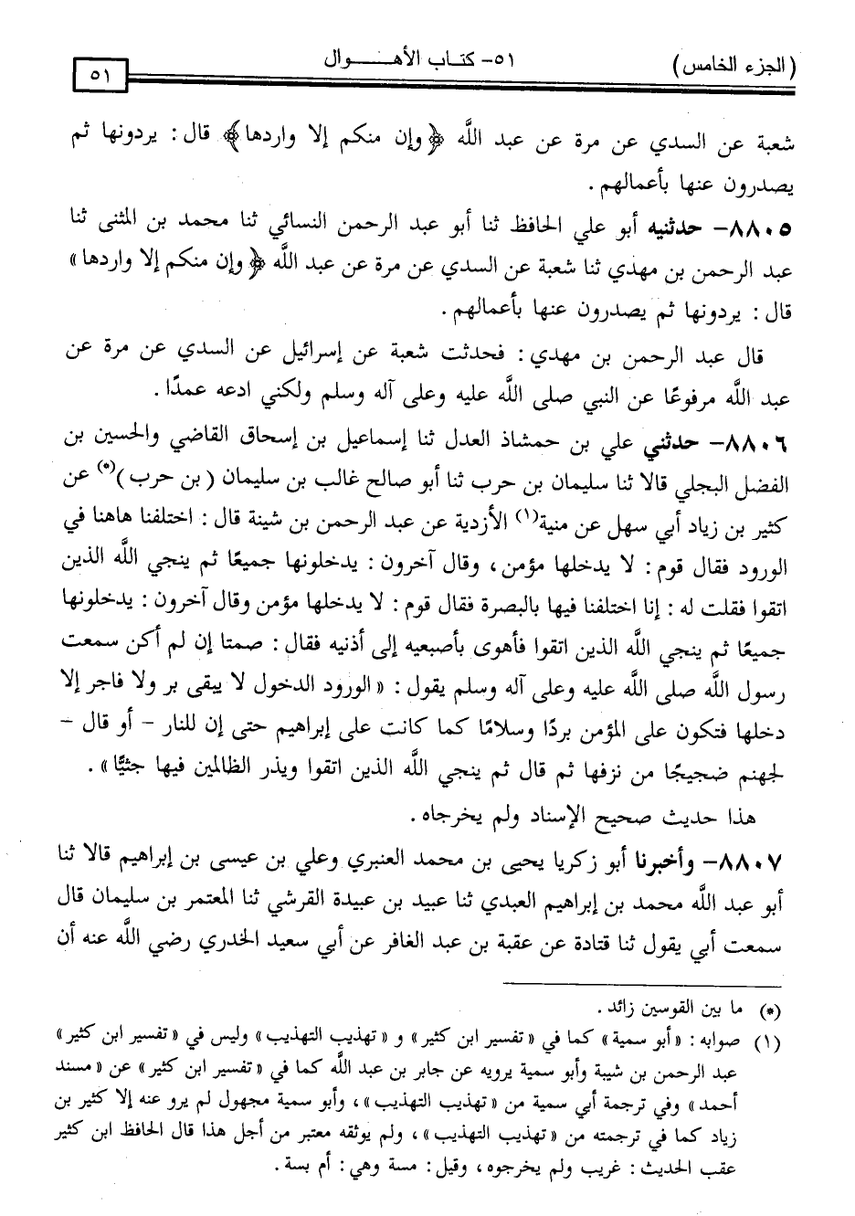 8805 - حَدَّثَنِيهِ أَبُو عَلِيٍّ الْحَافِظُ ، ثَنَا أَبُو عَبْدِ الرَّحْمَنِ النَّسَائِيُّ ، ثَنَا مُحَمَّدُ بْنُ الْمُثَنَّى ، ثَنَا عَبْدُ الرَّحْمَنِ بْنُ مَهْدِيٍّ ، ثَنَا شُعْبَةُ ، عَنِ السُّدِّيِّ ، عَنْ مُرَّةَ ، عَنْ عَبْدِ اللَّهِ: { وَإِنْ مِنْكُمْ إِلَّا وَارِدُهَا } [مريم: 71] قَالَ: " يَرِدُونَهَا ثُمَّ يَصْدُرُونَ عَنْهَا بِأَعْمَالِهِمْ "